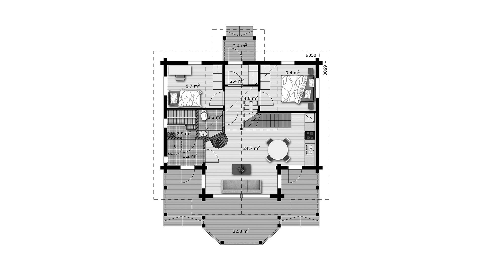 Фасад Kuusela, выдвинутый вперед по центру, придает зданию особый характер и обеспечивает жилую зону светом с трех разных сторон. Также дом оснащен чердаком, если вам необходимо дополнительное пространство.