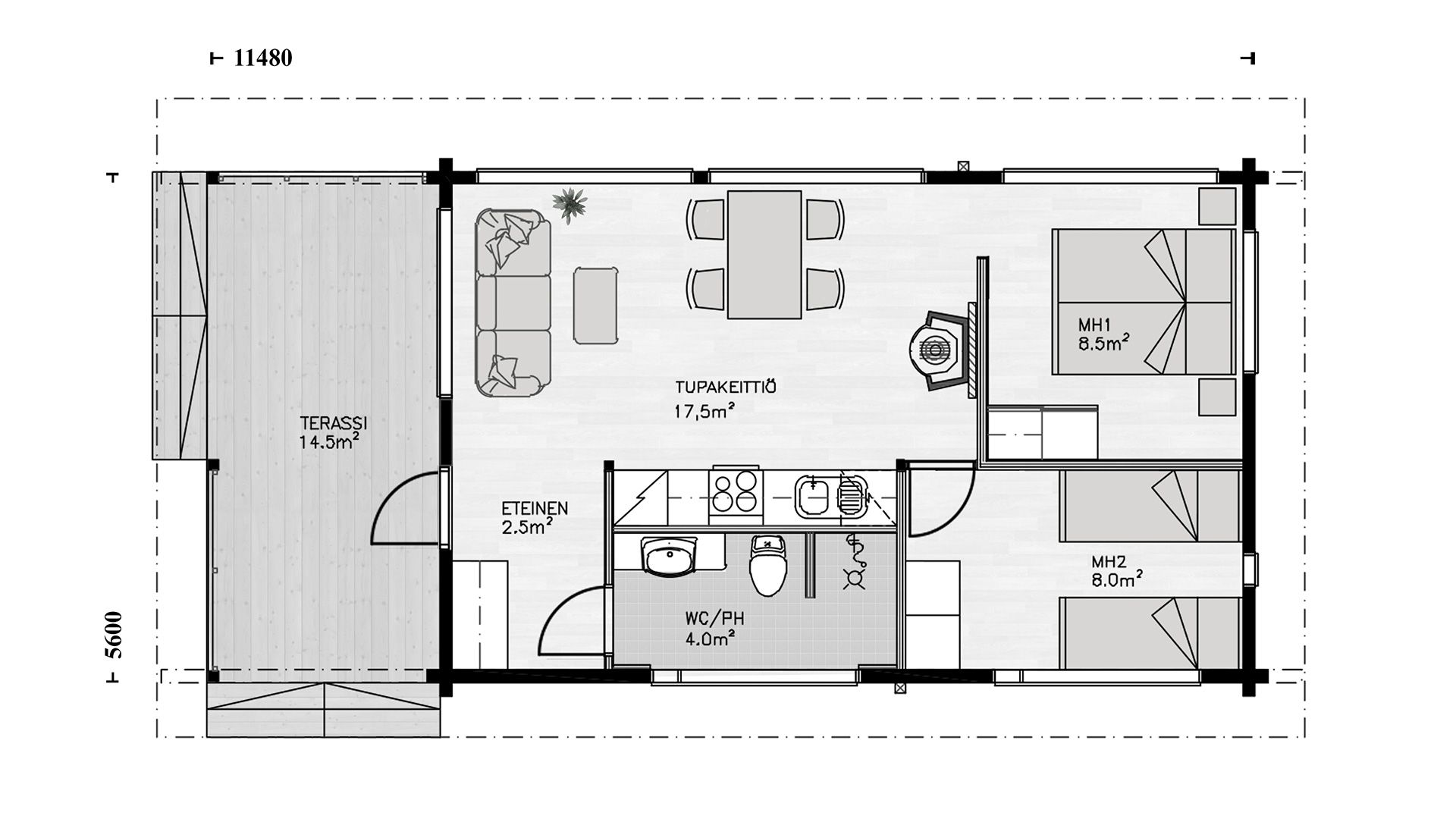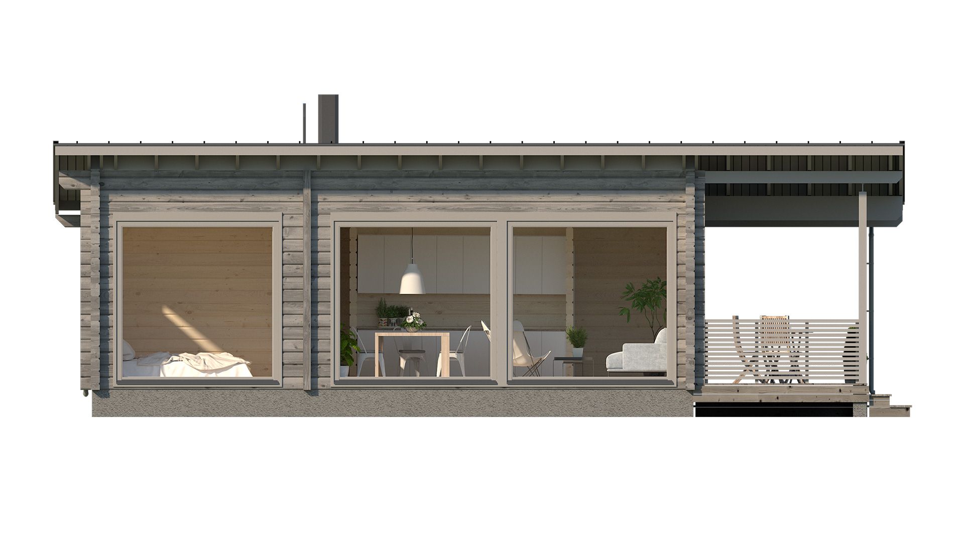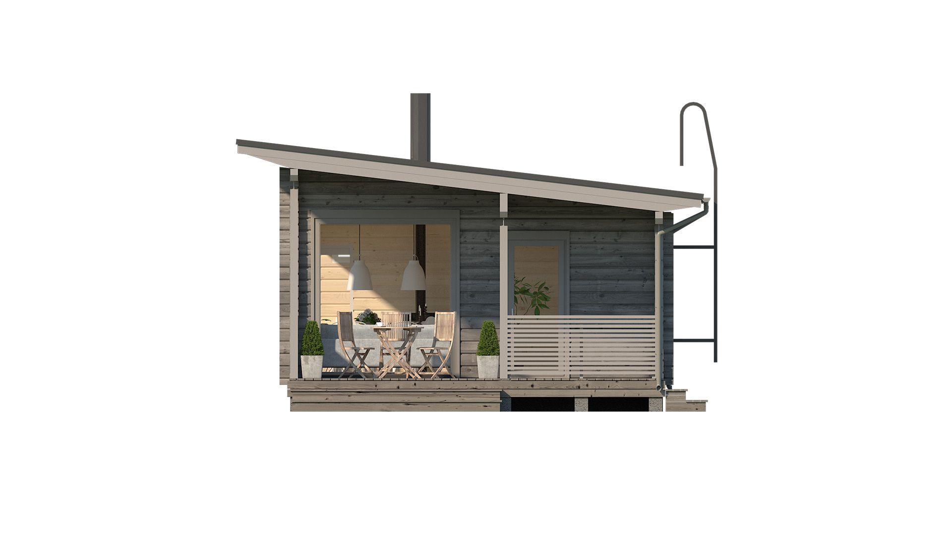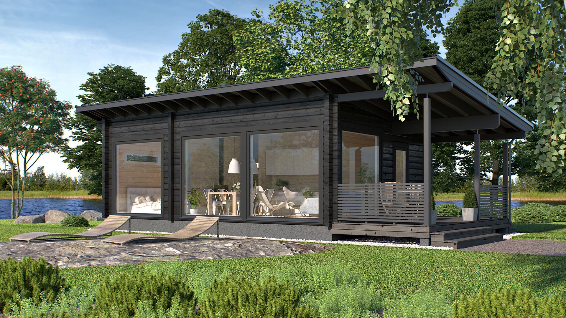 Невероятно большие окна деревянного дома Piste открываются на две стороны. Крытая терраса обеспечивает приятное времяпрепровождение и единение с природой.