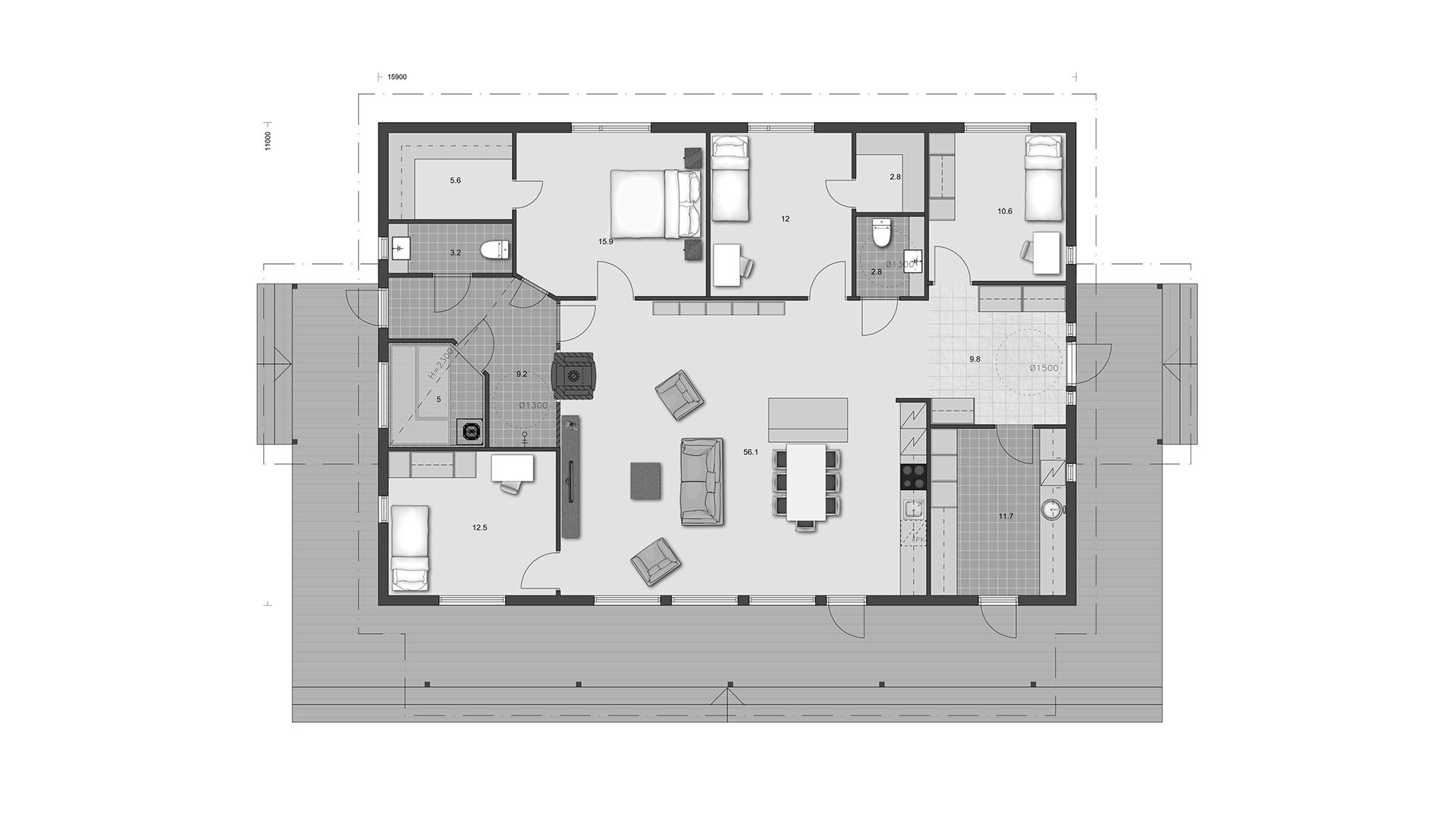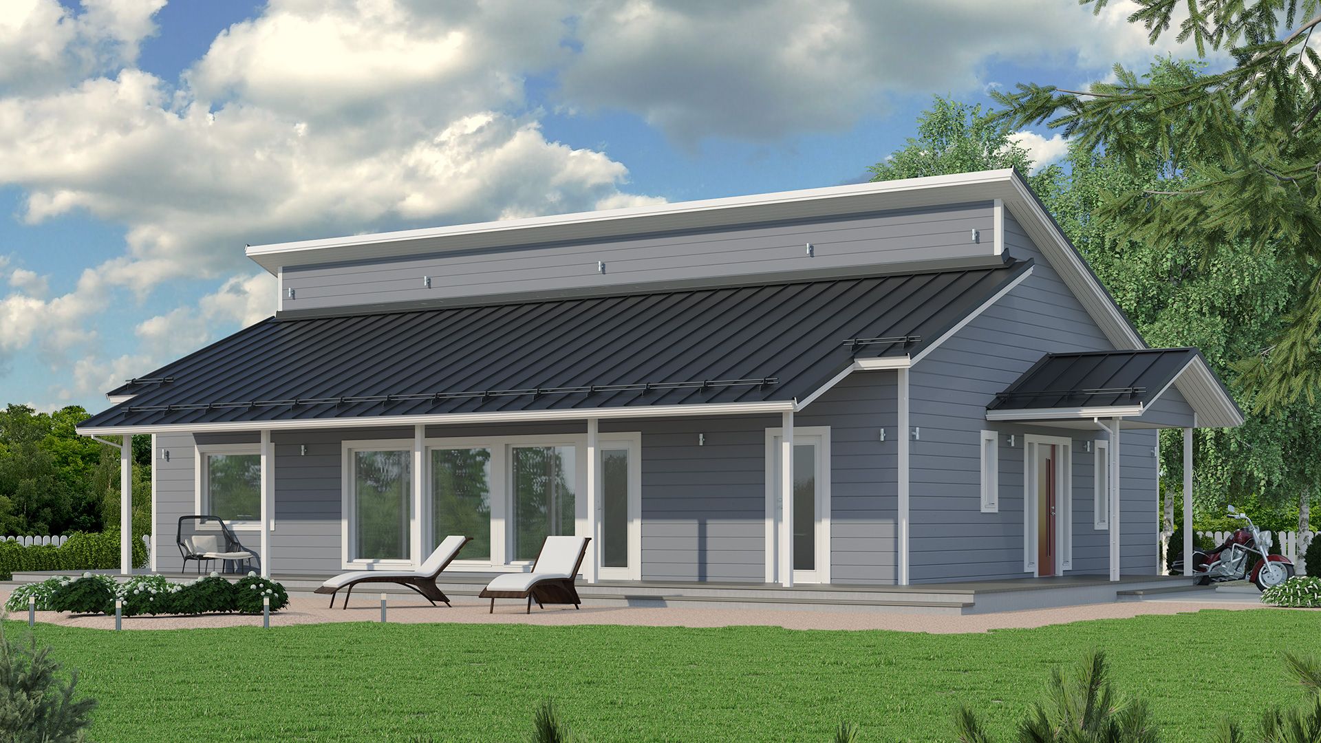 Двускатная крыша придает бревенчатому дому нотку роскоши. Это решение для крыши обеспечивает более высокую, чем обычно, высоту потолка.