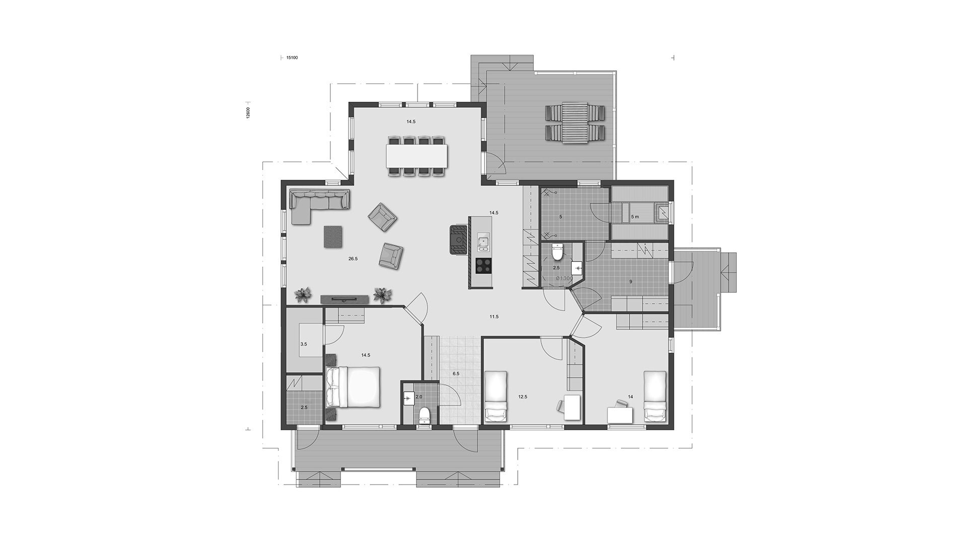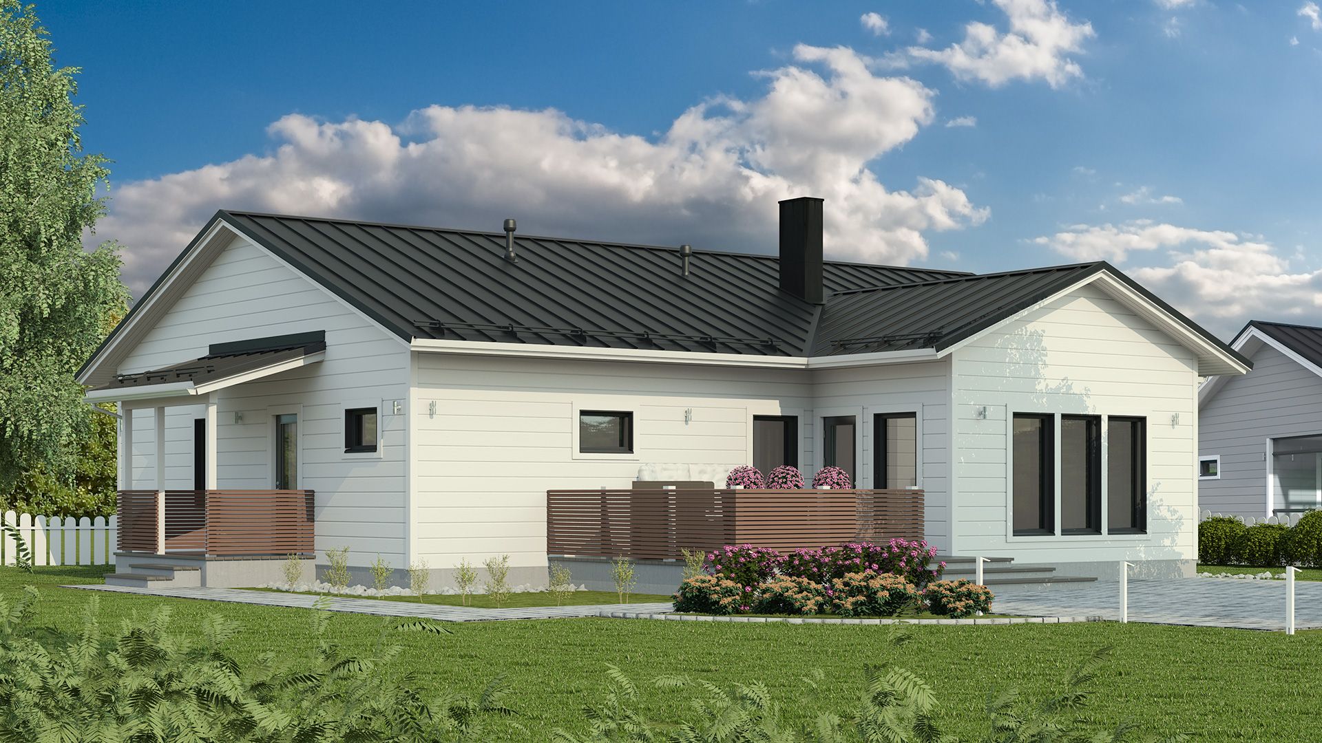 Бревенчатый дом имеет пространство во всех направлениях. Наклонный потолок достигает высоты более четырех метров, и все комнаты имеют приятное пространство. Высокие окна в столовой и гостиной позволяют свету и природе проникать во внутреннее пространство с высоким потолком.