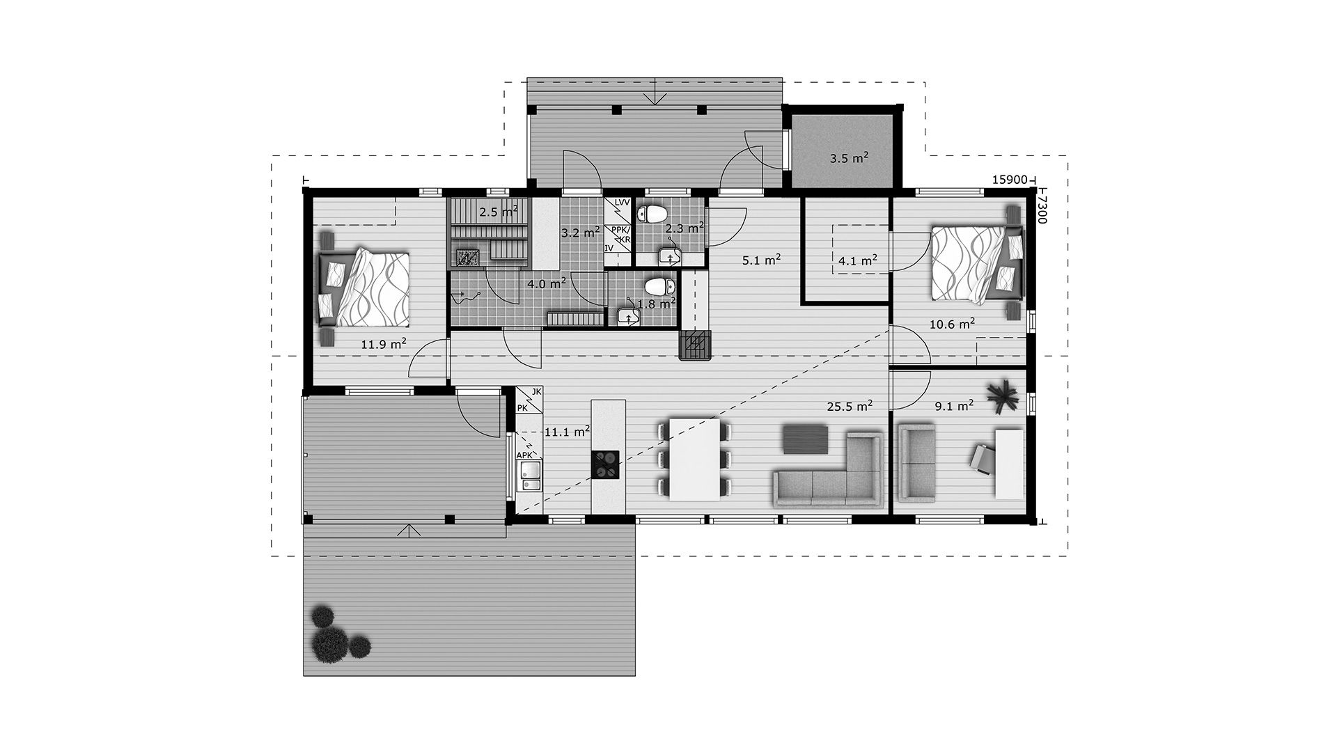 Отдельно стоящий дом с четкой планировкой, дает возможность легко адаптироваться в нем. Окна гостиной, которые доходят почти до пола, приближают окружающую природу. Гости сауны по достоинству оценят близость террасы, где они могут освежиться. В то же время на террасе достаточно места для общей трапезы и барбекю.