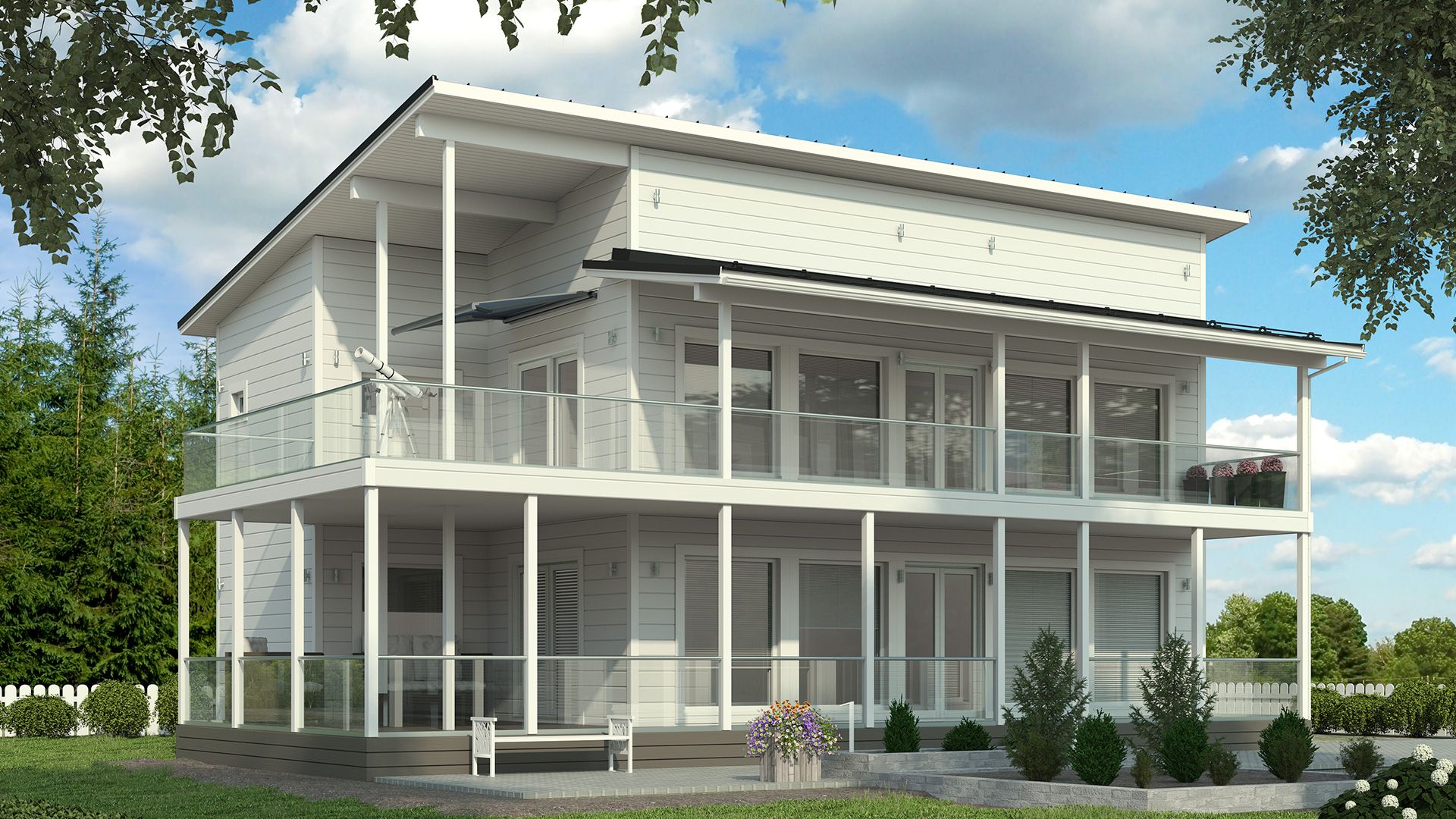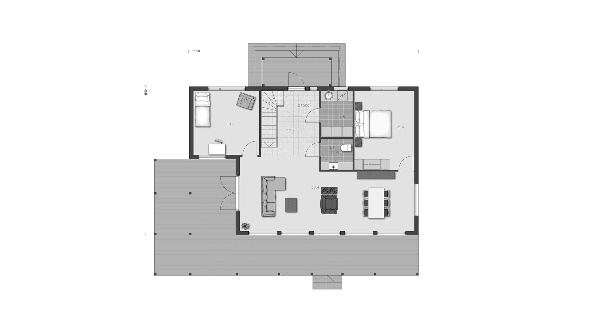 Вход в дом ведет вас в просторный вестибюль, который также предлагает выход на большую террасу. Светлая гостиная с кухней и сауной находятся на втором этаже, который кажется больше из-за балкона.