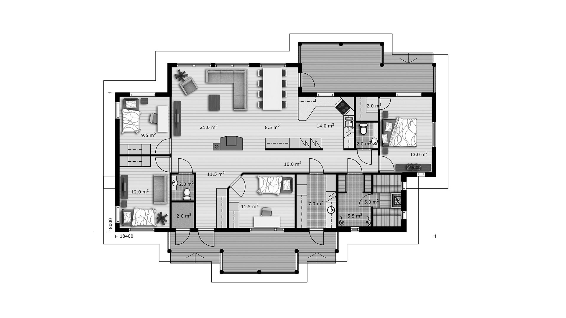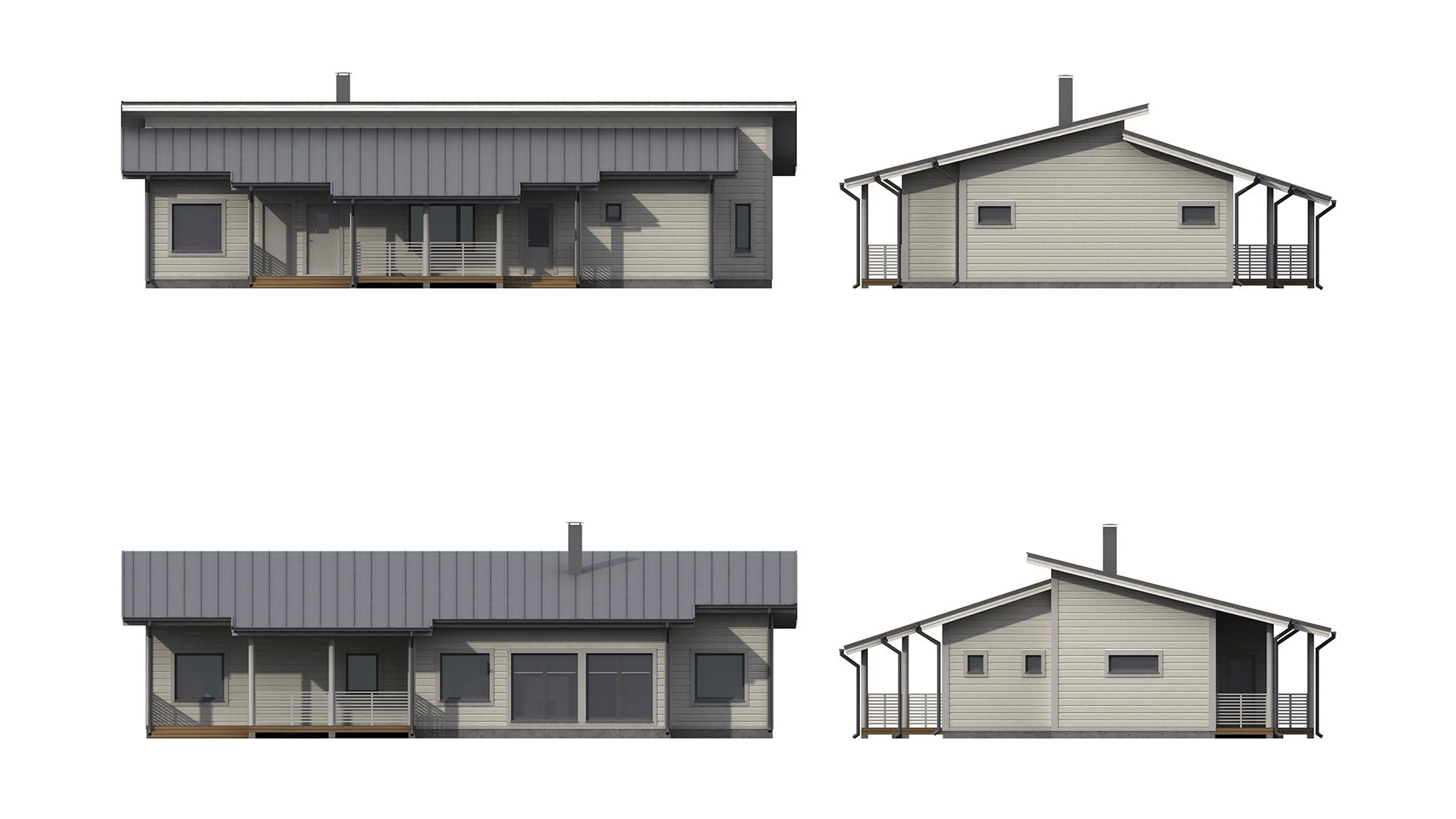 Ступенчатая двускатная крыша придает длинному дому современный вид. На крытой террасе достаточно места для обеденного стола, где летом можно приятно провести время.