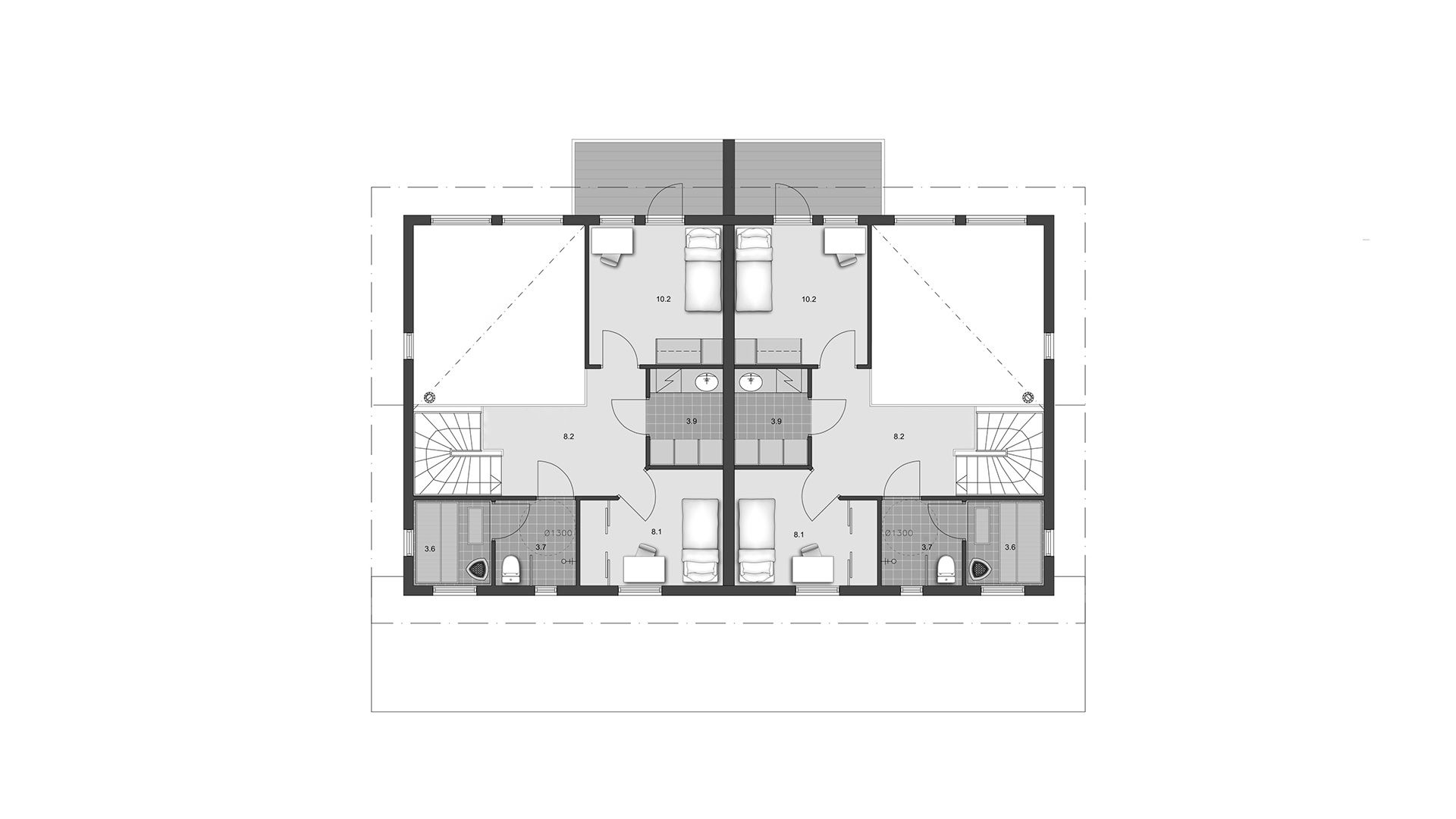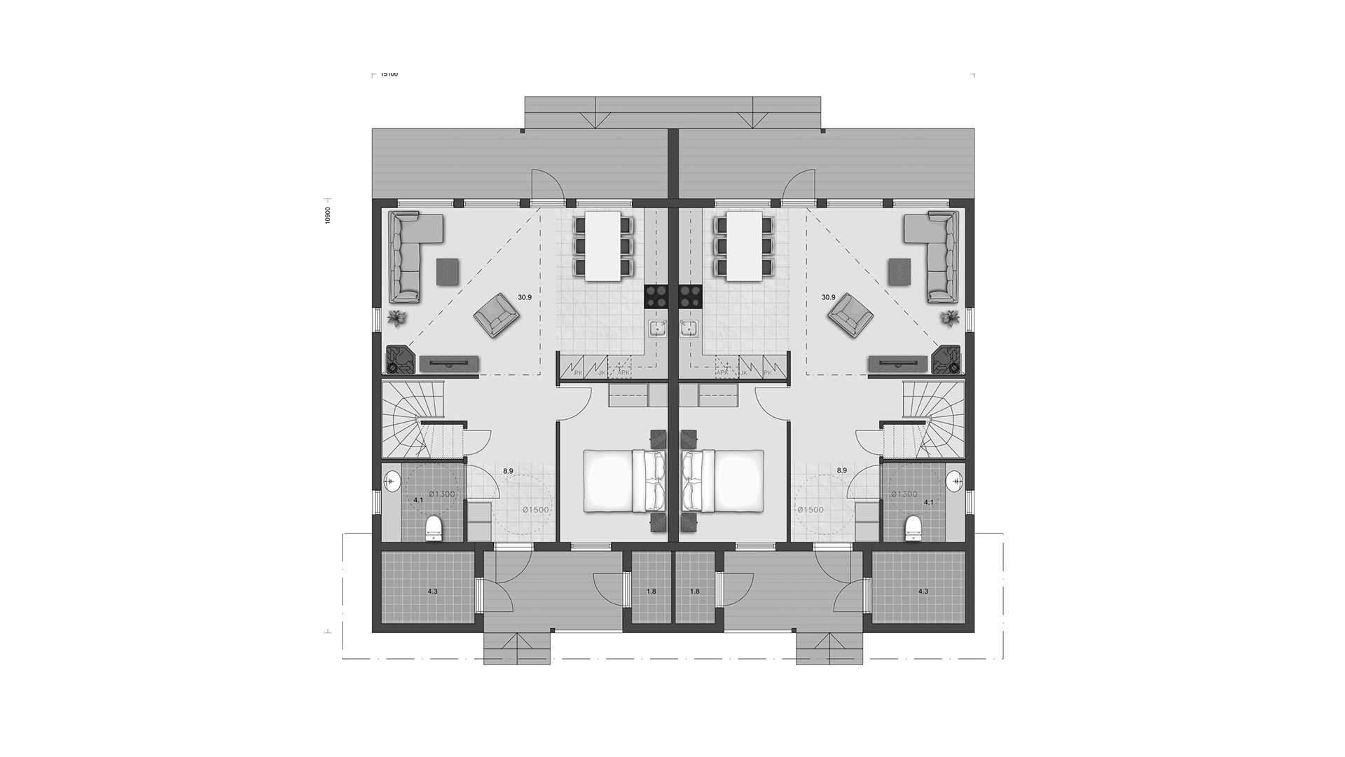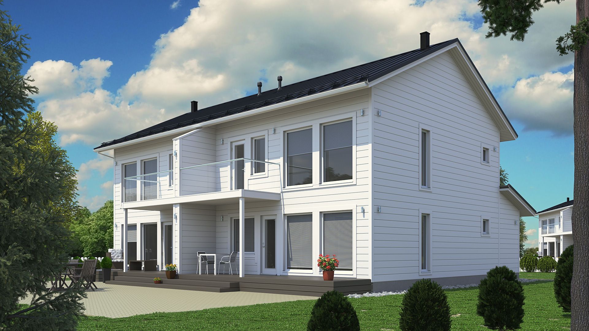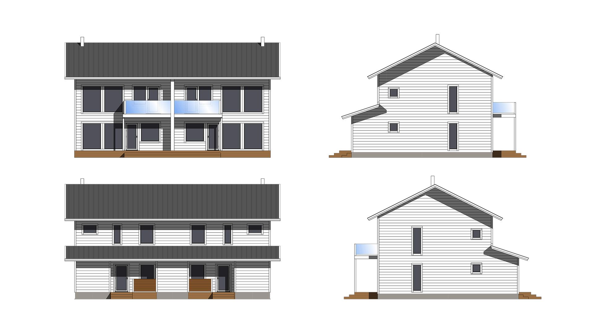 Дом для двух семей предоставляет жилые пространства на двух этажах таким образом, чтобы ванная комната и сауна были размещены наверху. Просторность нижнего этажа и яркость верхнего еще больше увеличиваются благодаря потолку гостиной, который открывается полностью вверх.