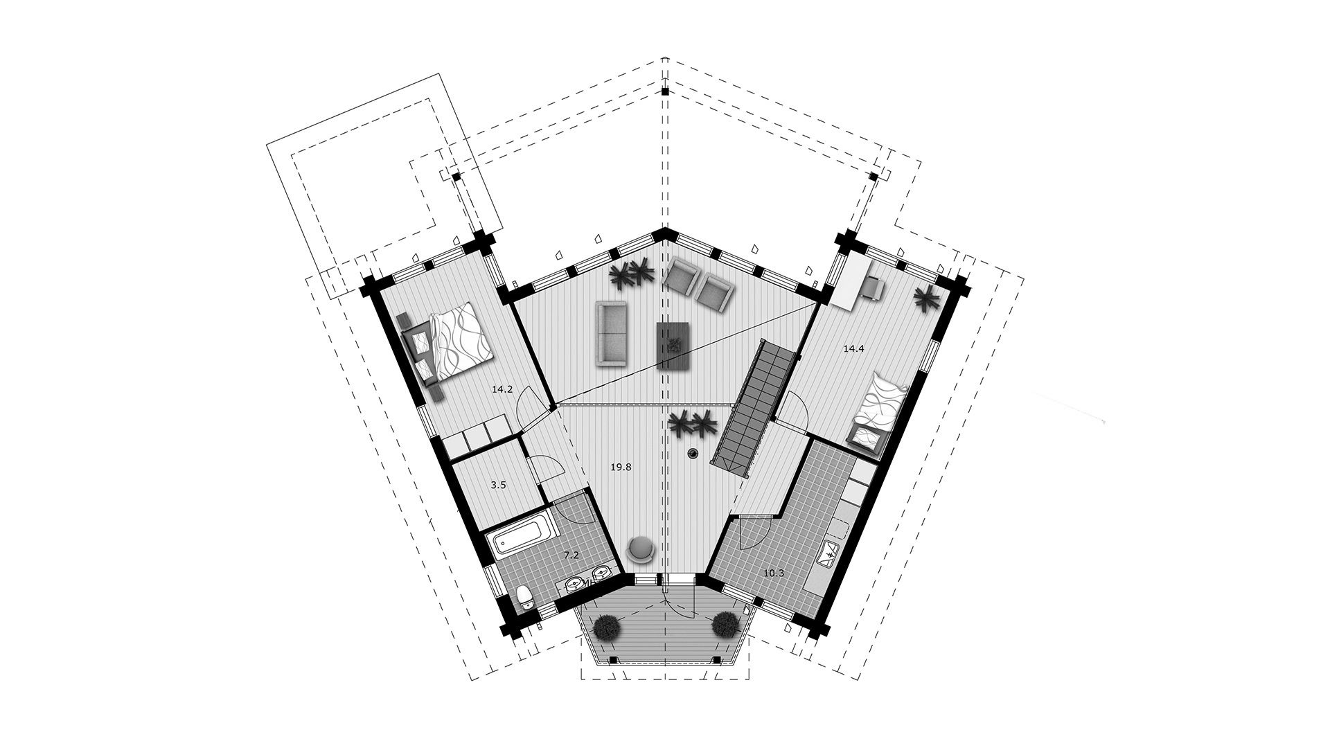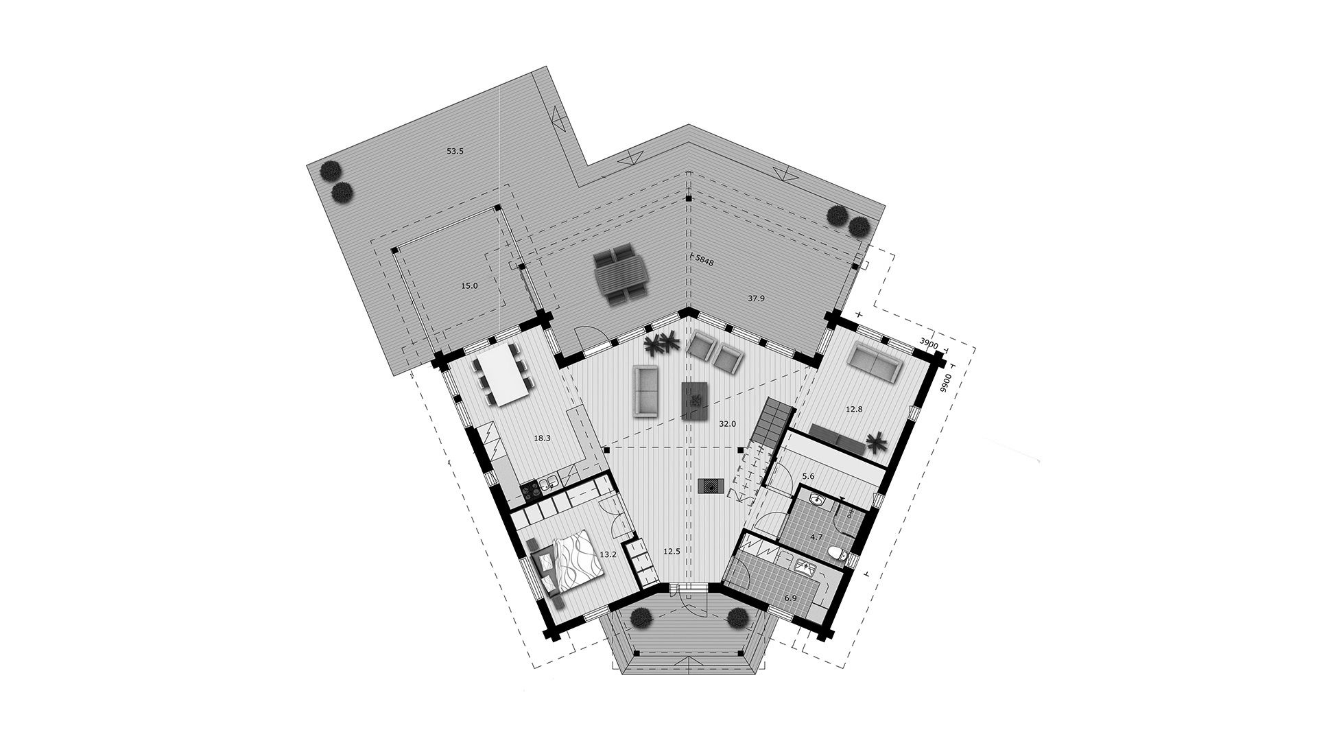 Холл-гостиная в дома полностью открыта. Поэтому окна, из которых открывается вид в нескольких направлениях, обеспечивают удивительную воздушность и яркость. Панорамный вид является приятным бонусом этого проекта.