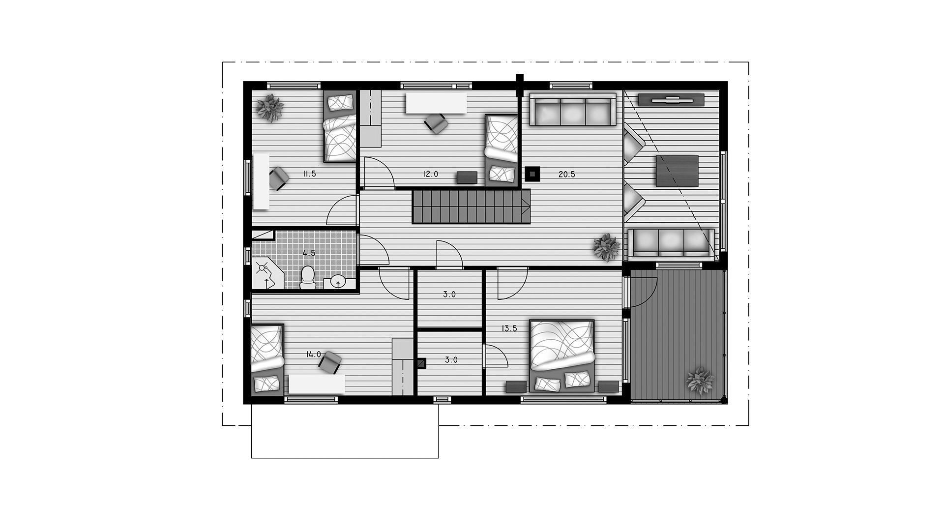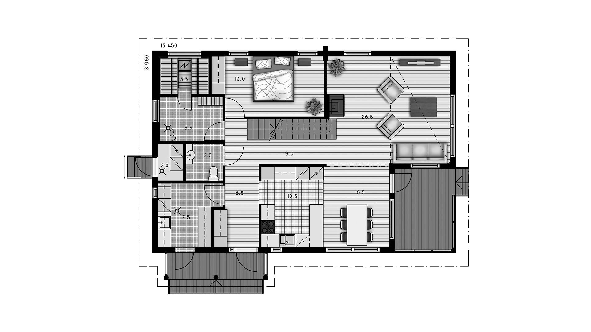 Гостиная в этом доме просторная и светлая благодаря потолку, который открыт до конька.