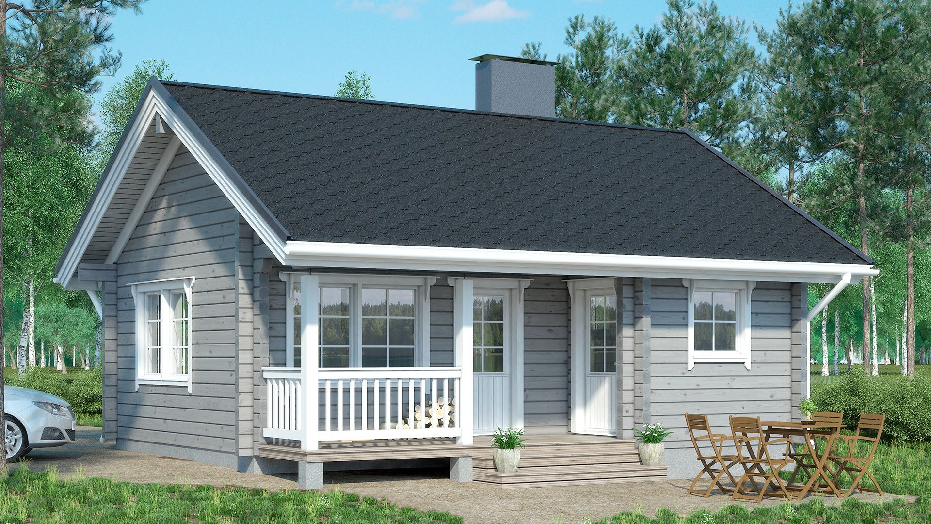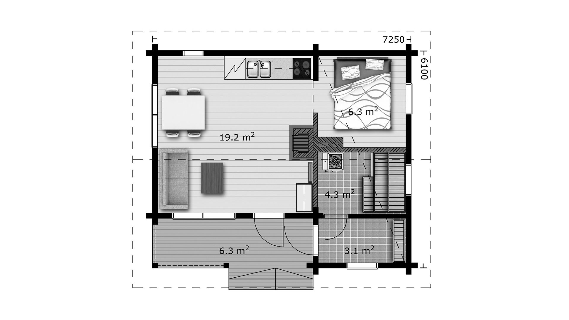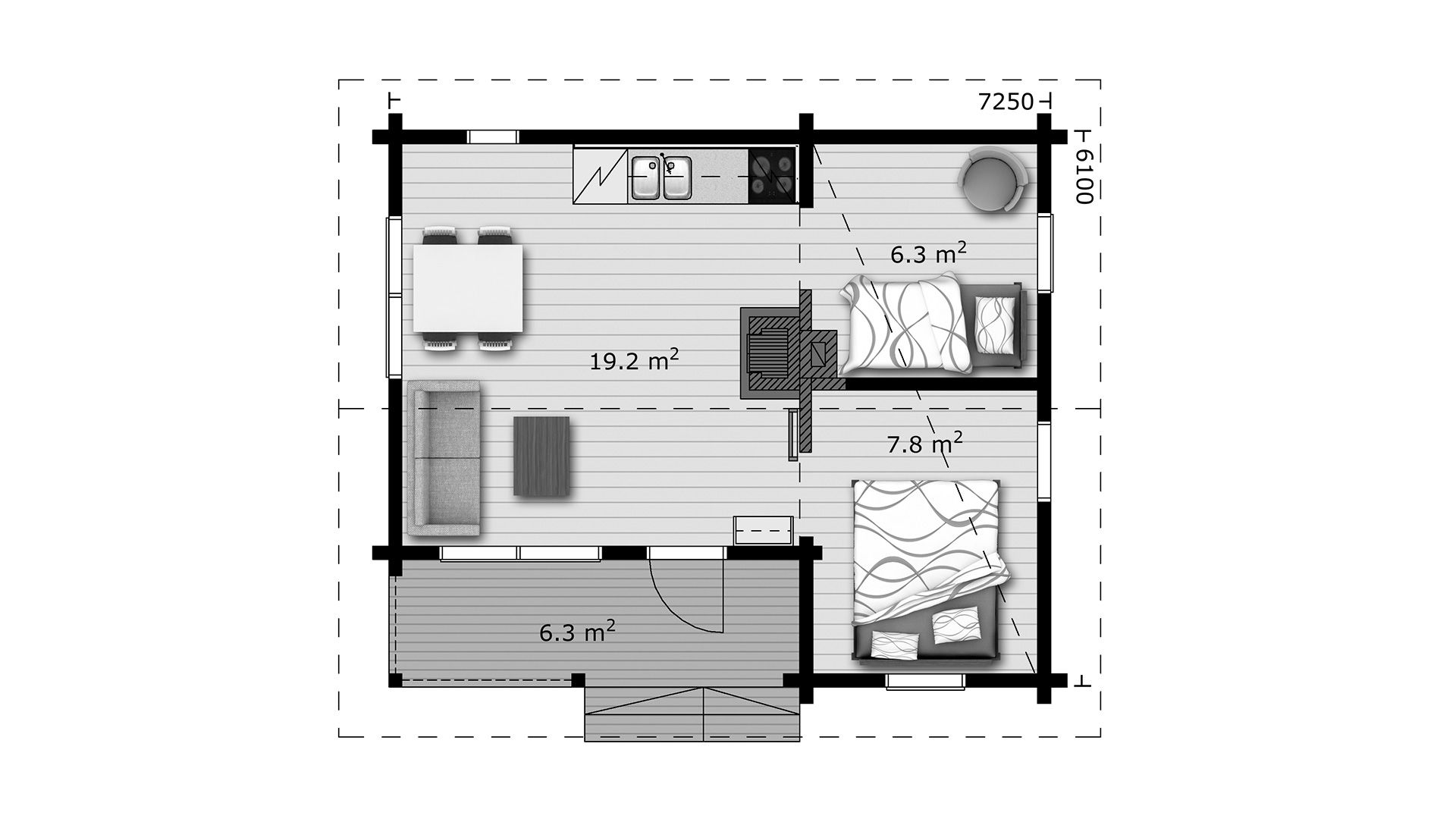 Hossa - это приятный компактный бревенчатый домик, в котором достаточно места для небольшой семьи. Возможен вариант планировки без сауны, превратив это помещение в спальню.