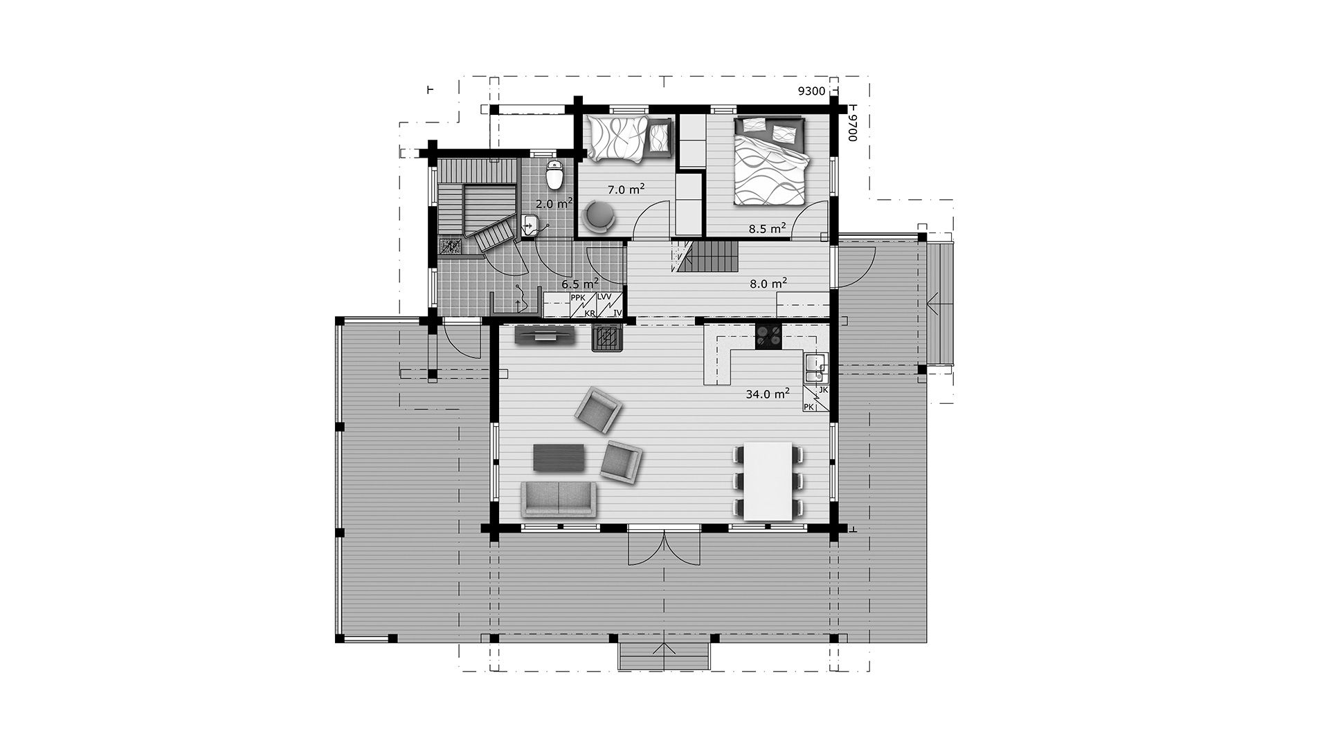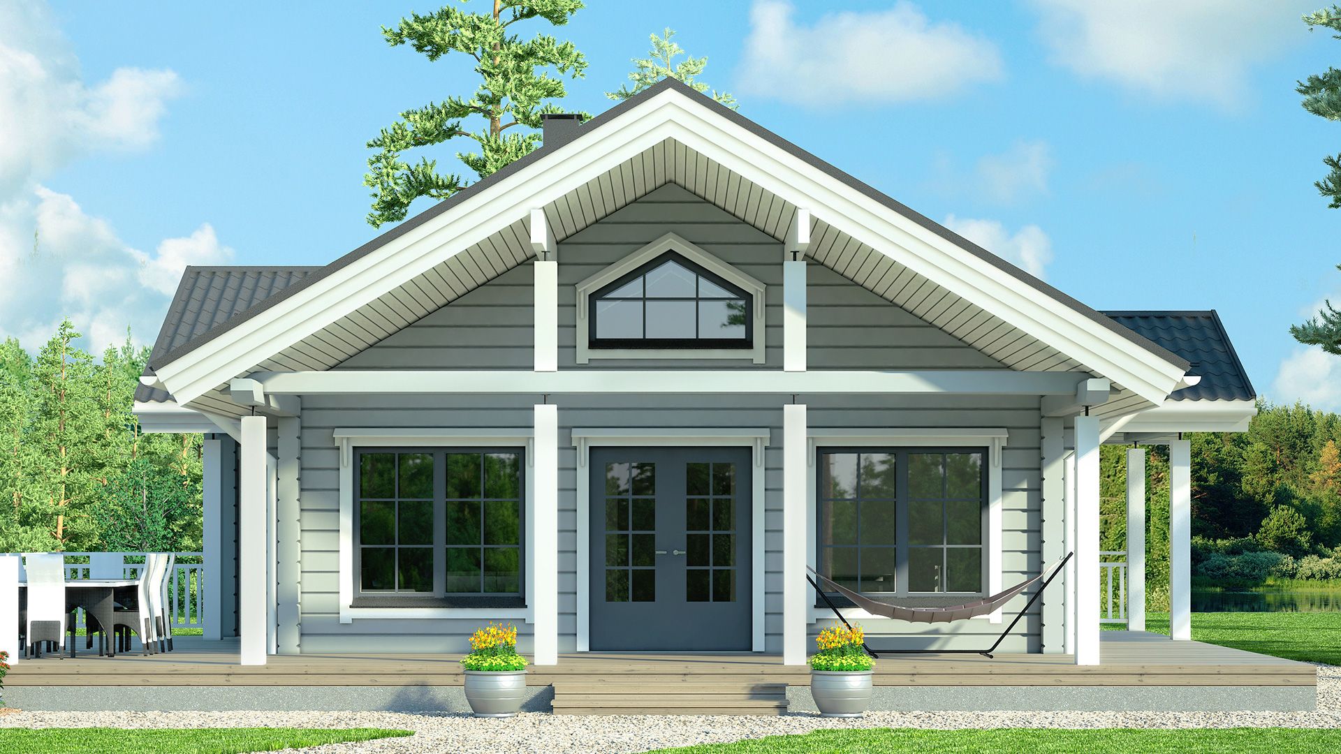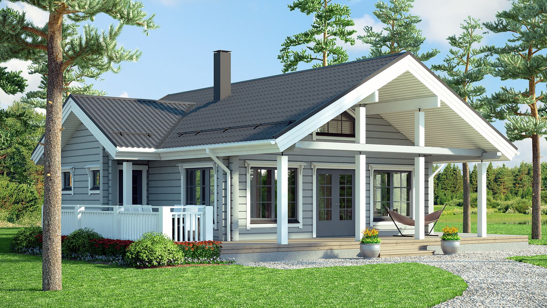 Деревянный дом Onkamo предоставляет простор и максимальный комфорт проживания. Просторная гостиная с наклонным потолком и кухня составляют главный уют дома.