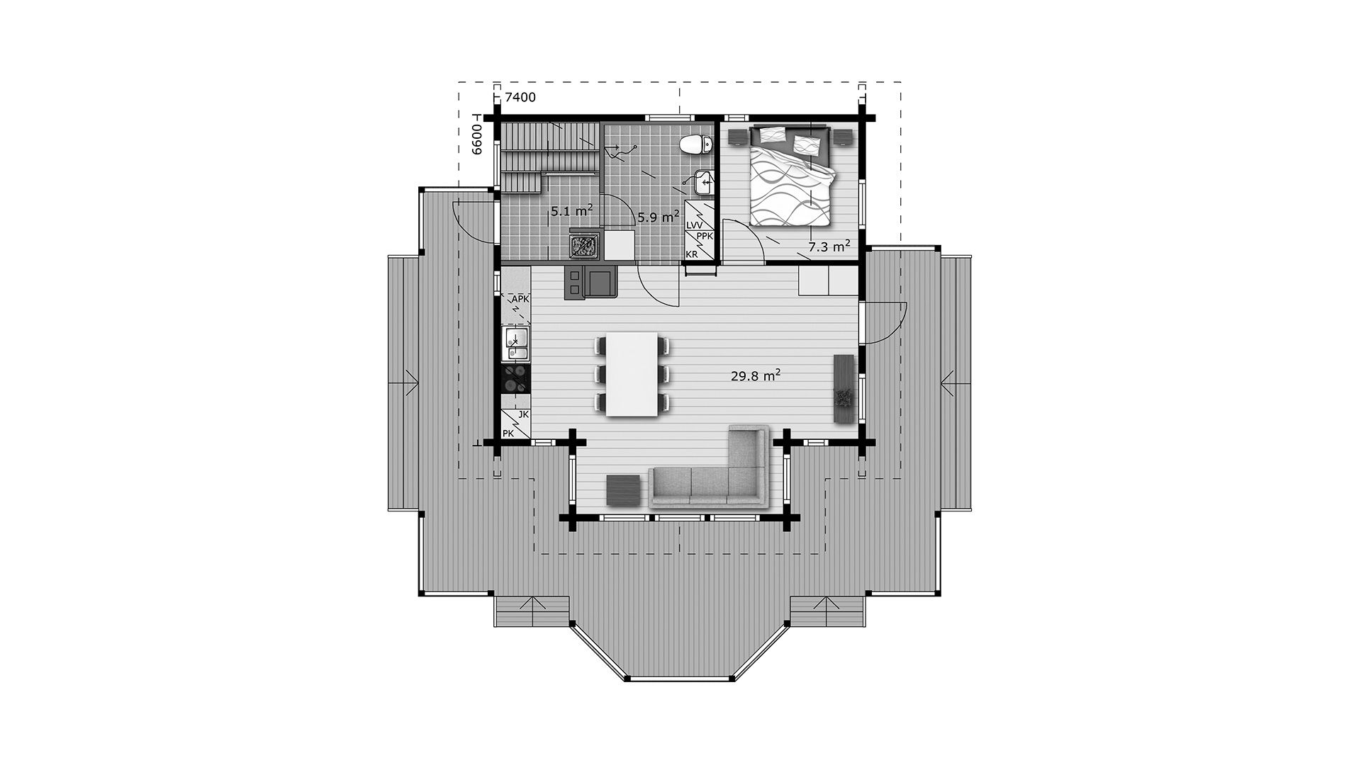 Деревянный дом Purnu - это дом с террасами большими окнами, которые пропускают естественный свет во внутренние помещения. В доме достаточно места как для жилых помещений, так и для сауны.