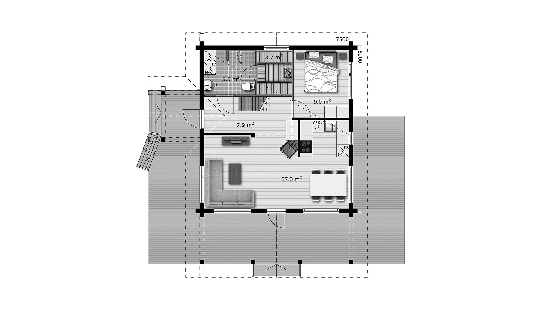 Террасы и колонны деревянного дома Tavela имеют уникальный внешний вид. Кухня-гостиная и жилая зона дома вместе с каминами составляют прекрасную интерьерную композицию. Спальня на нижнем этаже расположена в тихом и спокойном месте. Также имеется пространство высотой 160 см в мансарде на верхнем этаже дома и множество других помещений на нижнем этаже для времяпровождения, проживания или хранения вещей.
