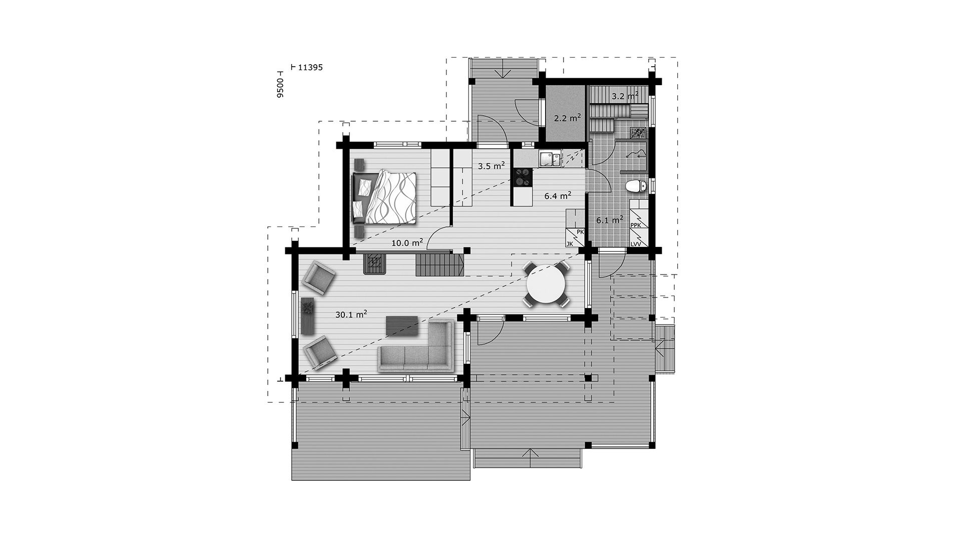 Деревянный дом Ukkola имеет интересную планировку этажей, которая обеспечивает свет и виды на жилые помещения со всех сторон. Гостиная в доме просторная благодаря большой высоте помещения. На большой передней террасе достаточно места для барбекю и обеденного стола.