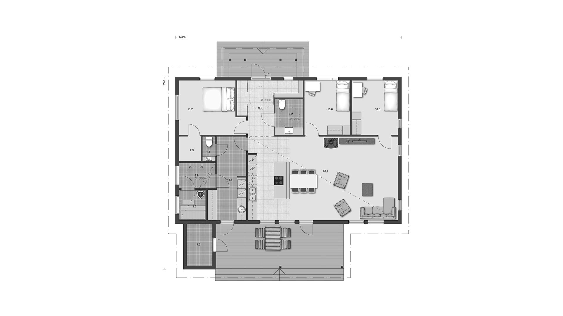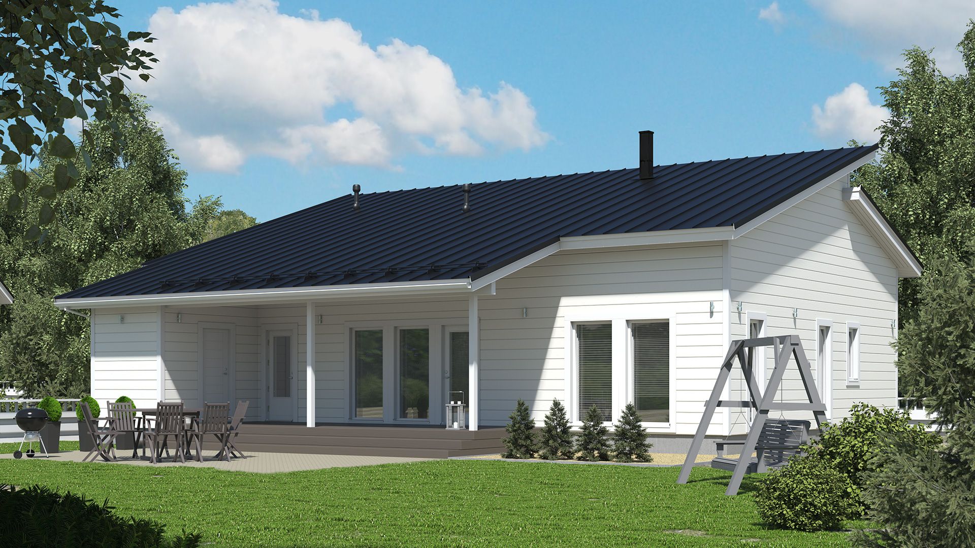 Жизнь в просторной и светлой Халликке построена вокруг большой жилой площади. Оборудованная островом кухня элегантно сочетается с обеденной зоной и гостиной, откуда также можно попасть на крытую террасу.