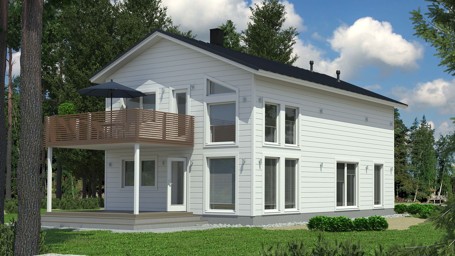 Это функциональный и современный бревенчатый дом, который можно построить даже на небольшом участке.