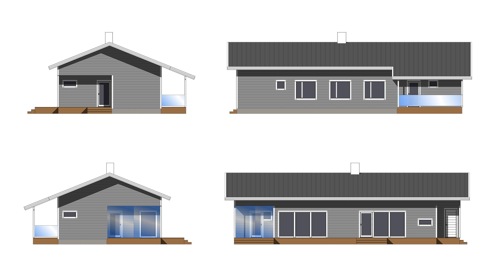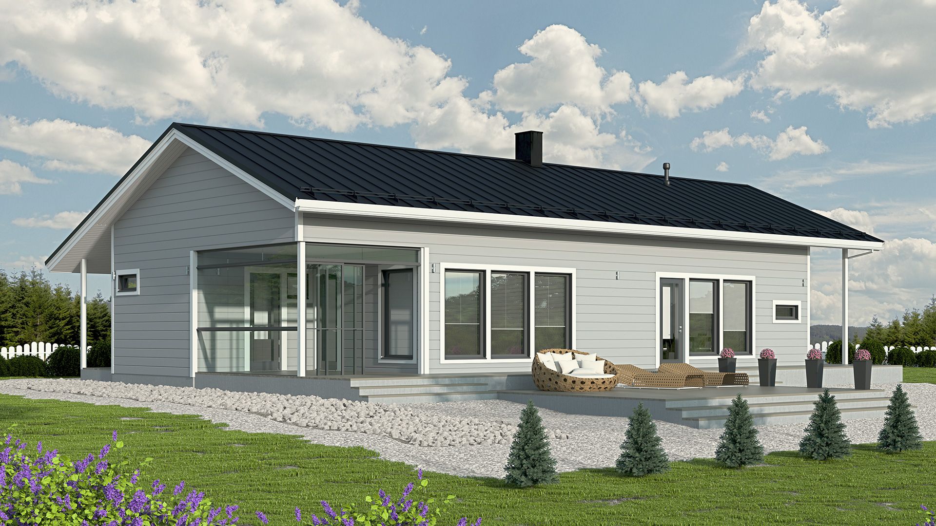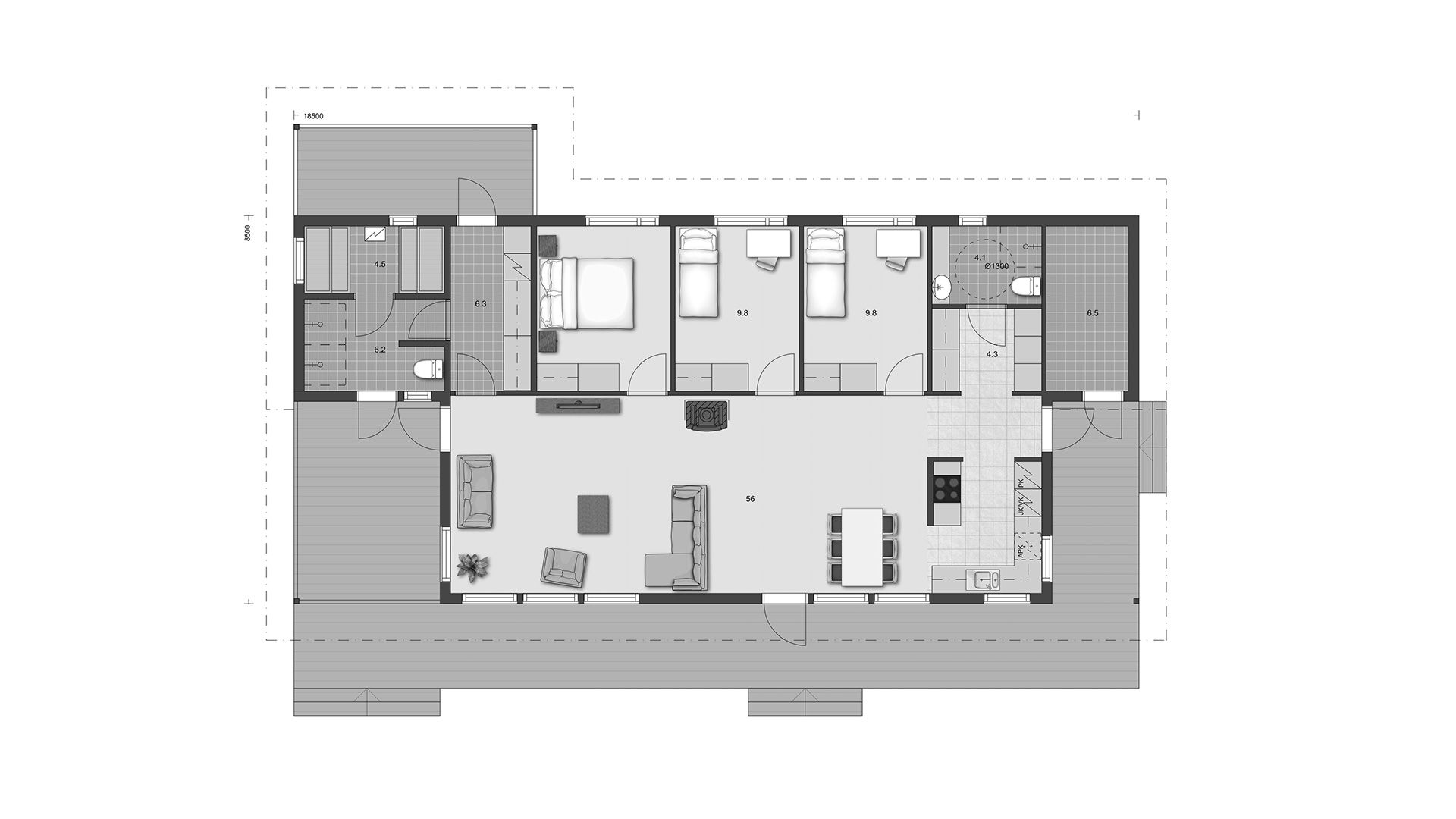 Дом окружен террасами и застекленным патио. Просторная гостиная с кухней и жилыми зонами образуют общие пространства семьи в основной части дома. В этом доме можно вести функциональный повседневный образ жизни и комфортно проводить свободное время.