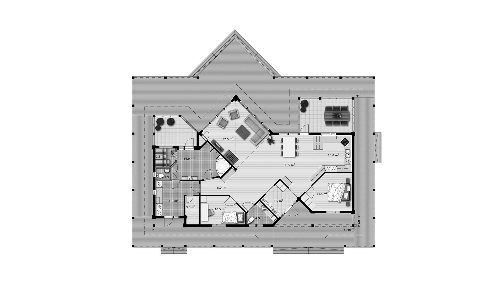 Пространство жилой зоны собирает свет с двух сторон через панорамные окна. Этот проект для вас, если вам надоели стандарты.
