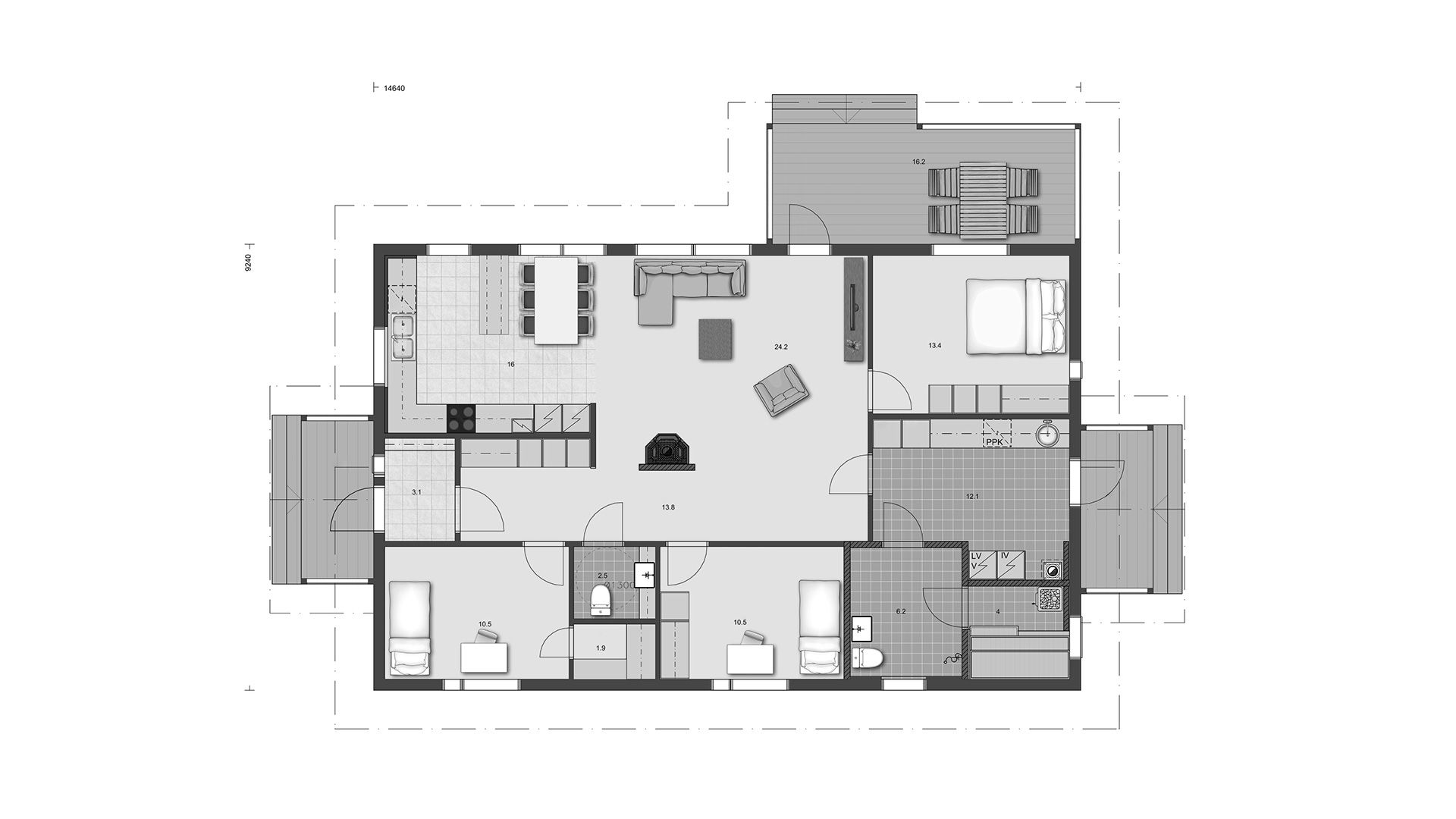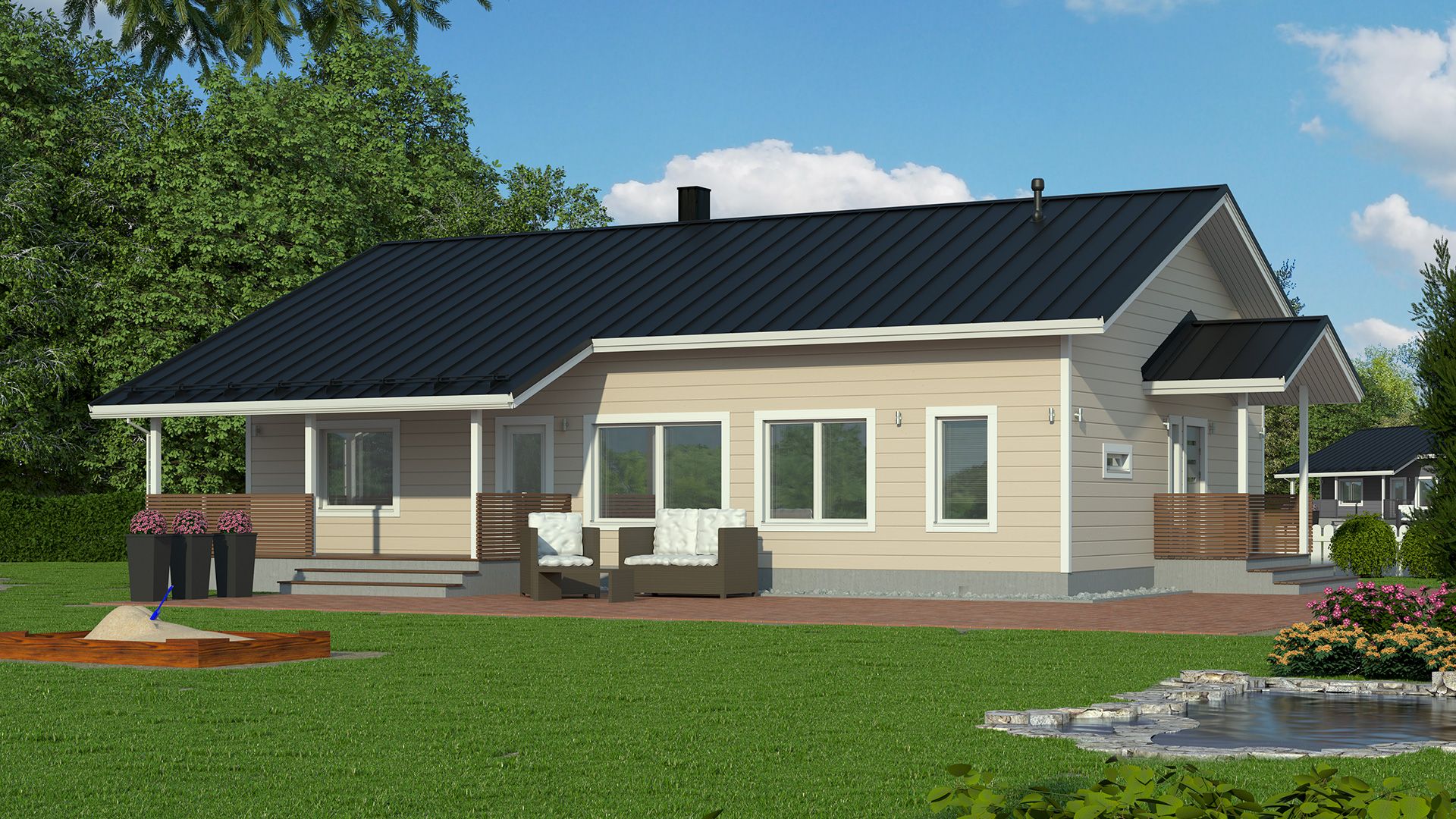 Дом особенно подходит для семей с детьми. Повседневная жизнь будет легче благодаря большим окнам кухни-гостиной, которые выходят в сад за домом. Так что вы можете следить за детьми, не отрываясь от домашних дел.