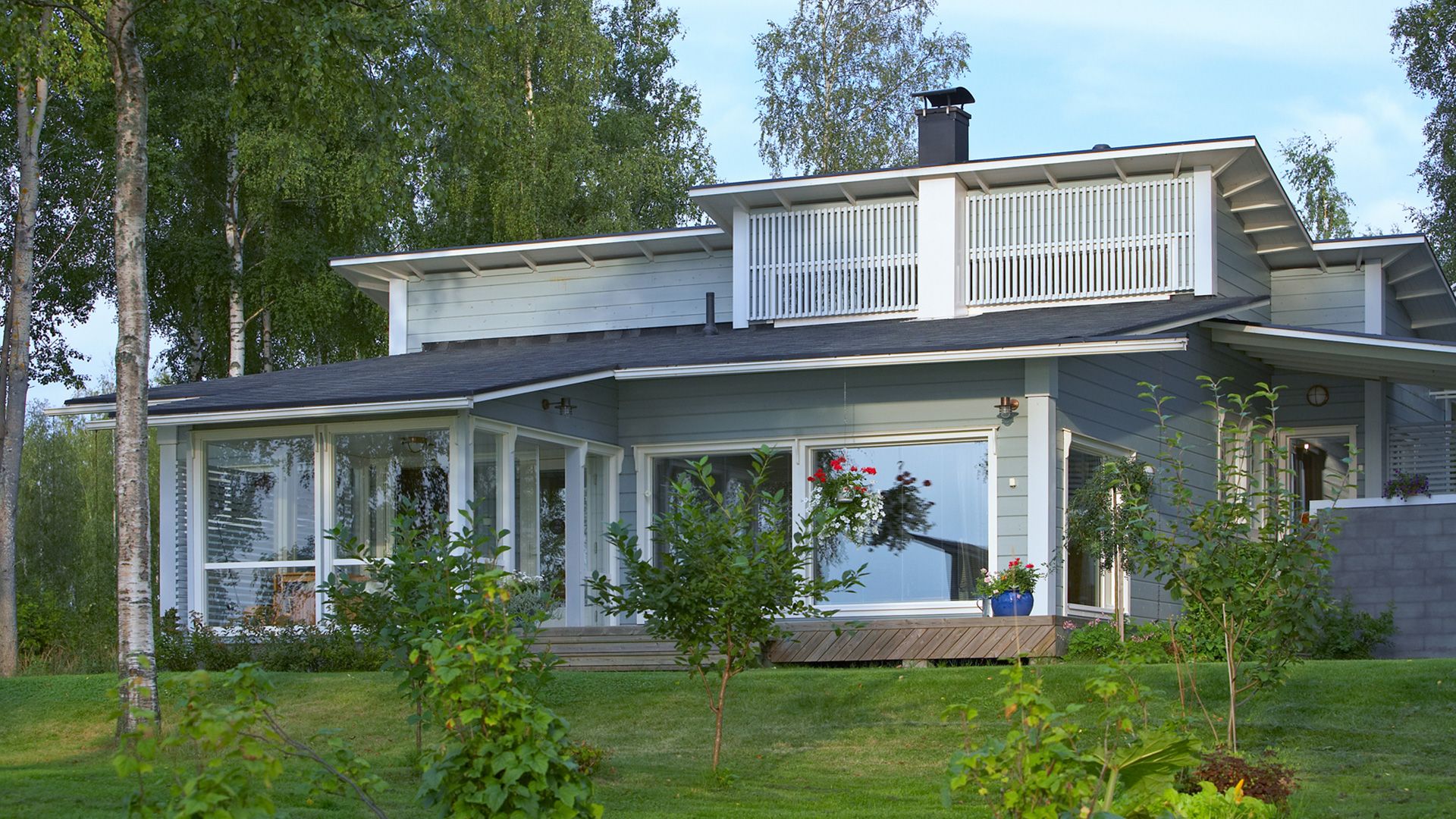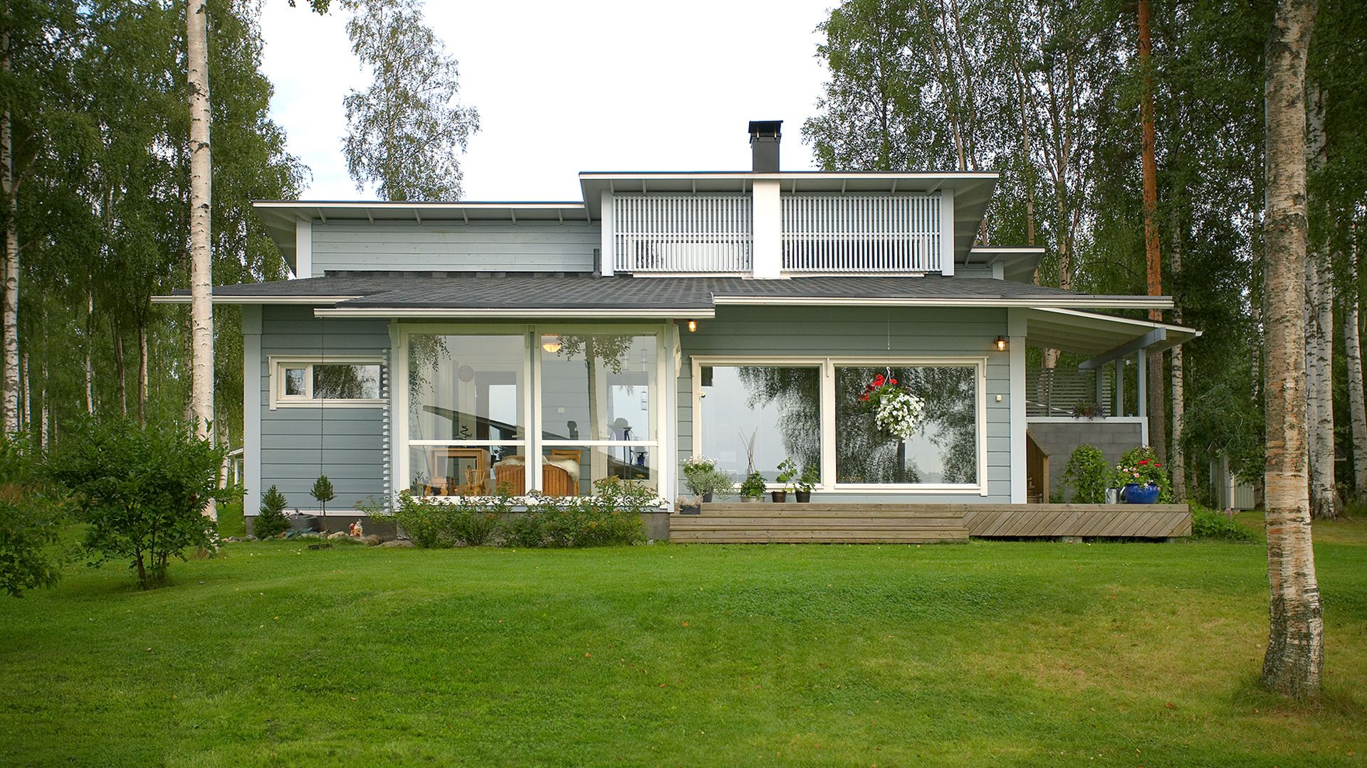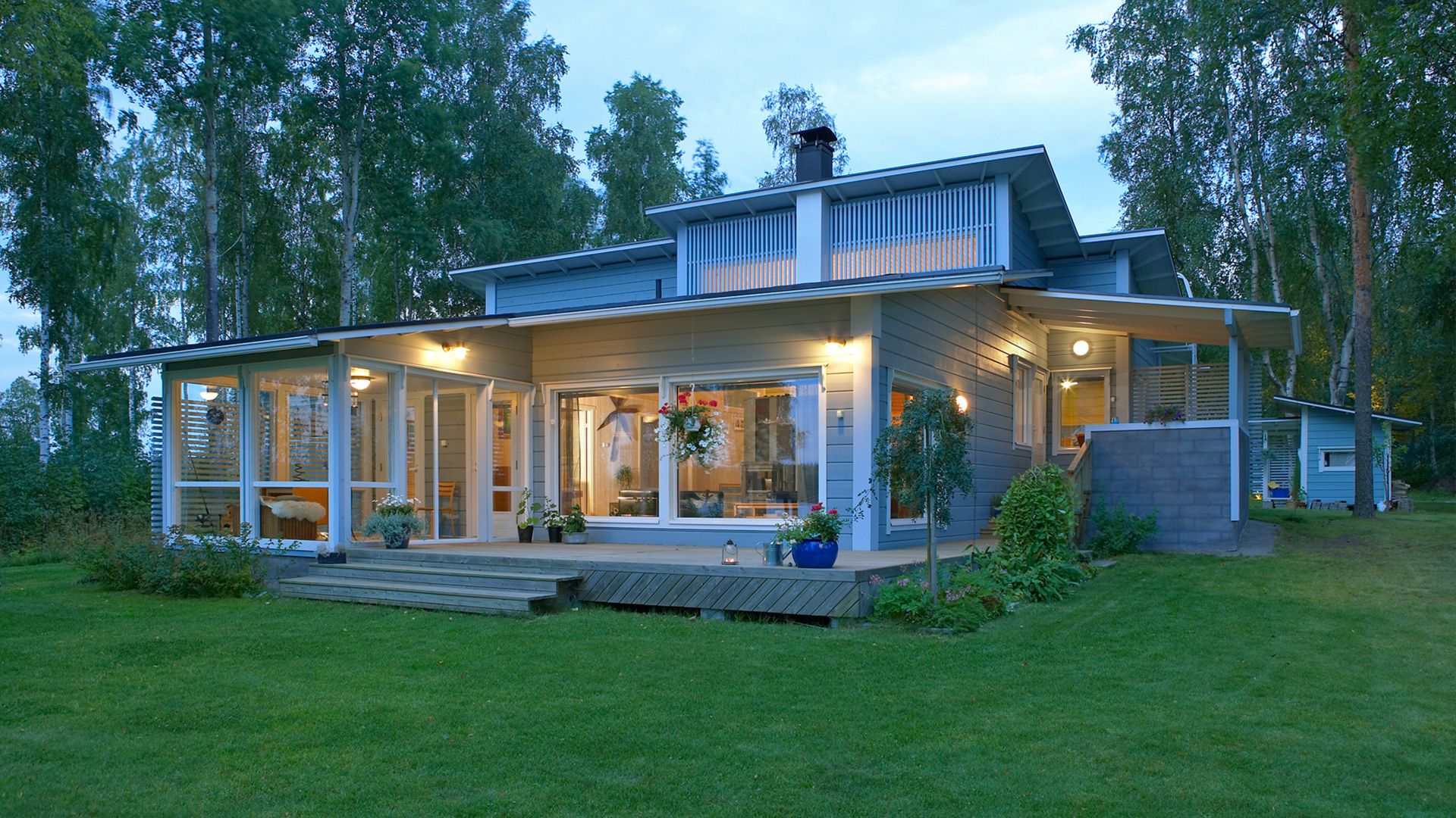 Бревенчатый дом, который был представлен на жилищной ярмарке в Савонлинне, воплощает современную архитектуру, где брус и стекло объединены. Окна, расположенные на всю высоту потолка с белыми наличниками, делают центральную часть здания светлой и просторной.