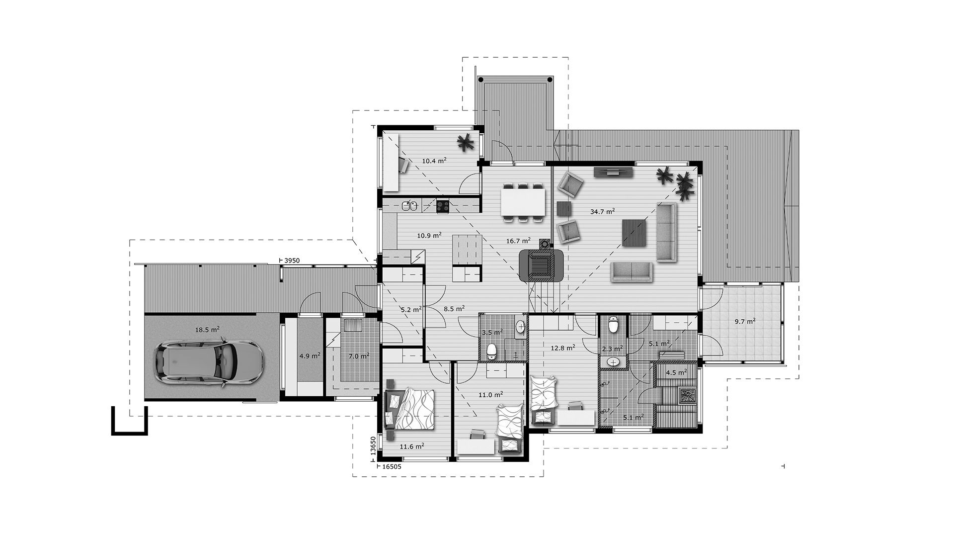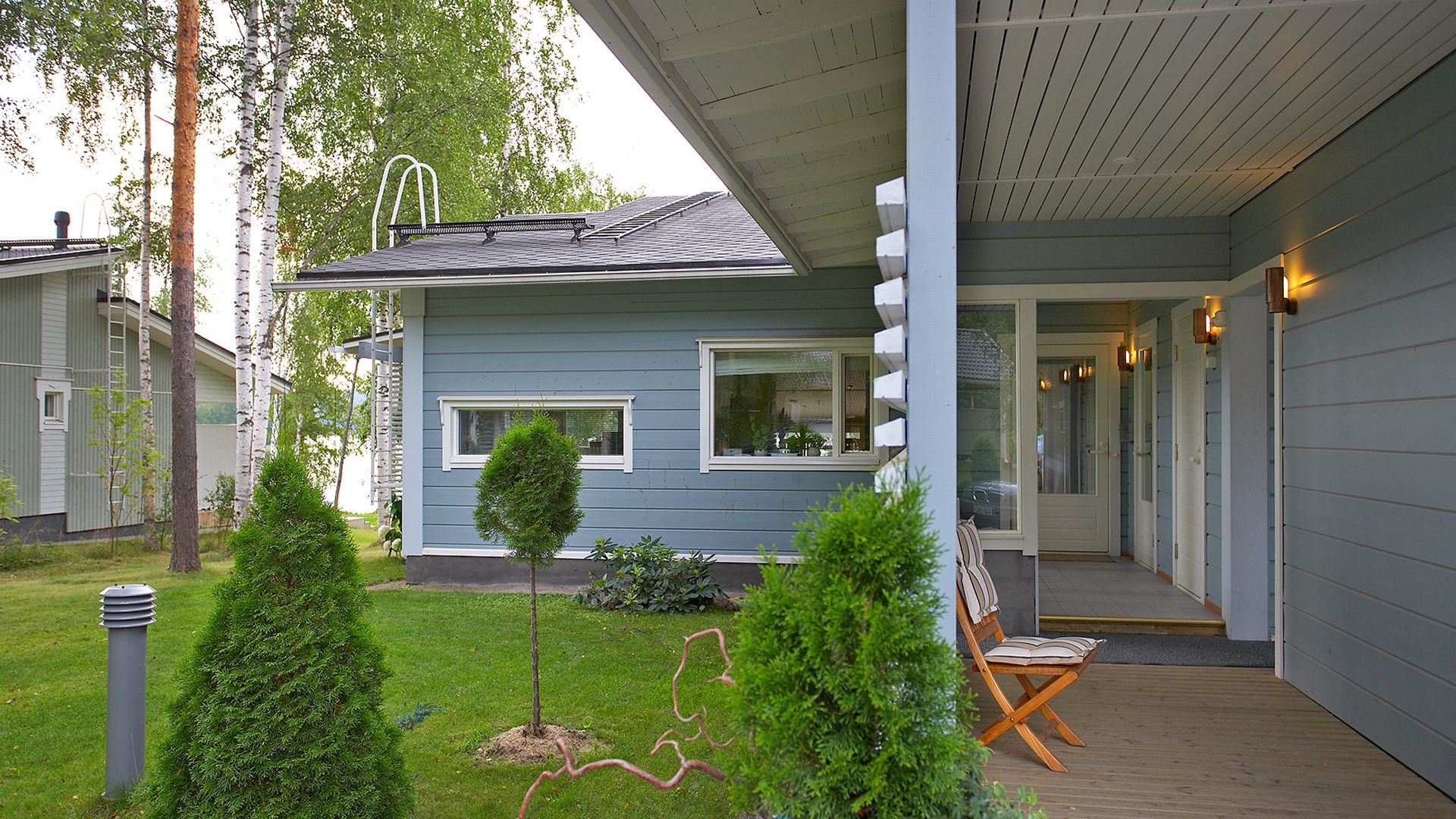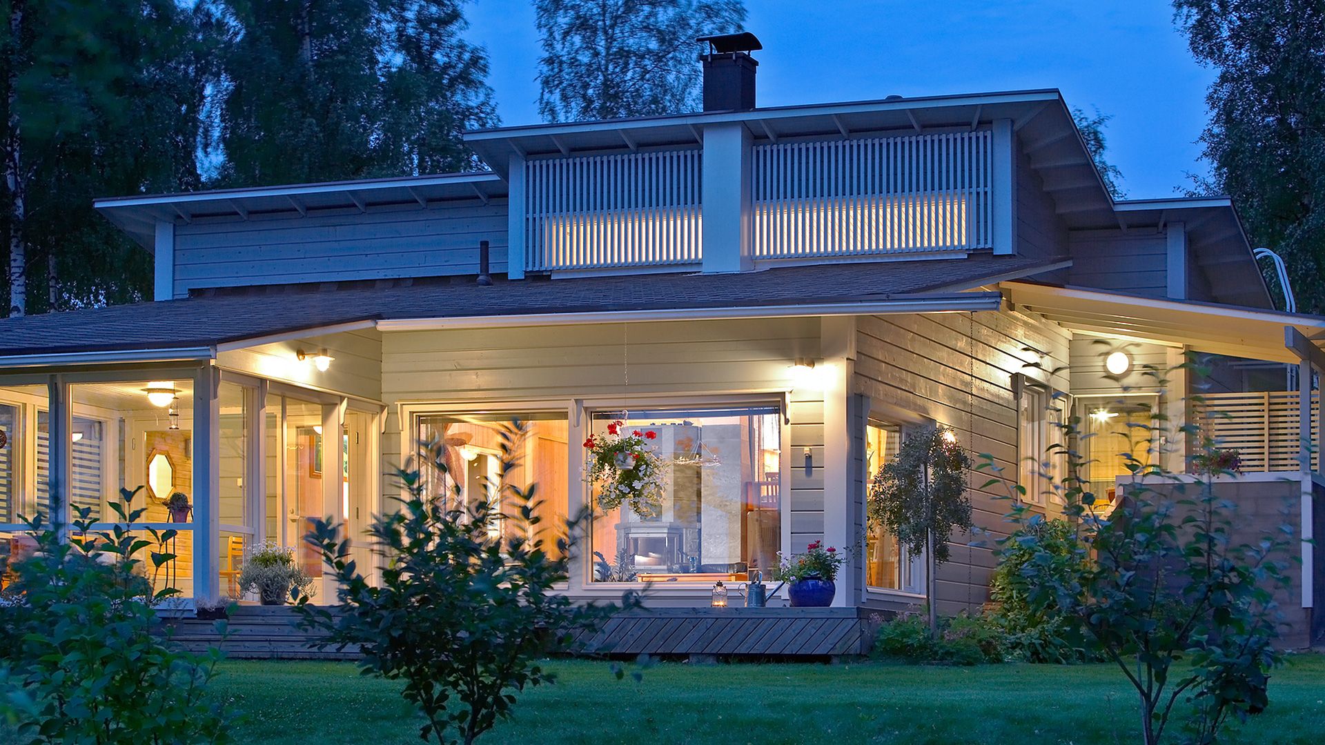 Бревенчатый дом, который был представлен на жилищной ярмарке в Савонлинне, воплощает современную архитектуру, где брус и стекло объединены. Окна, расположенные на всю высоту потолка с белыми наличниками, делают центральную часть здания светлой и просторной.