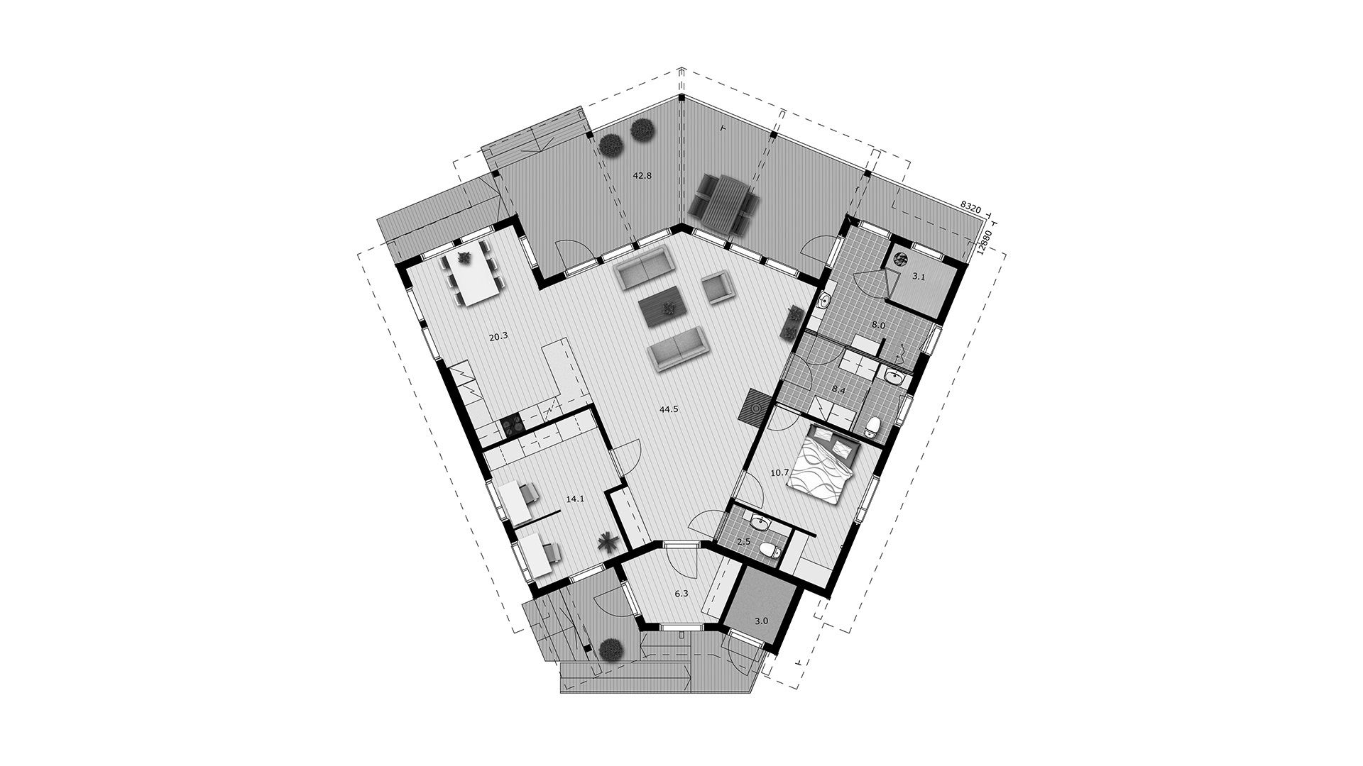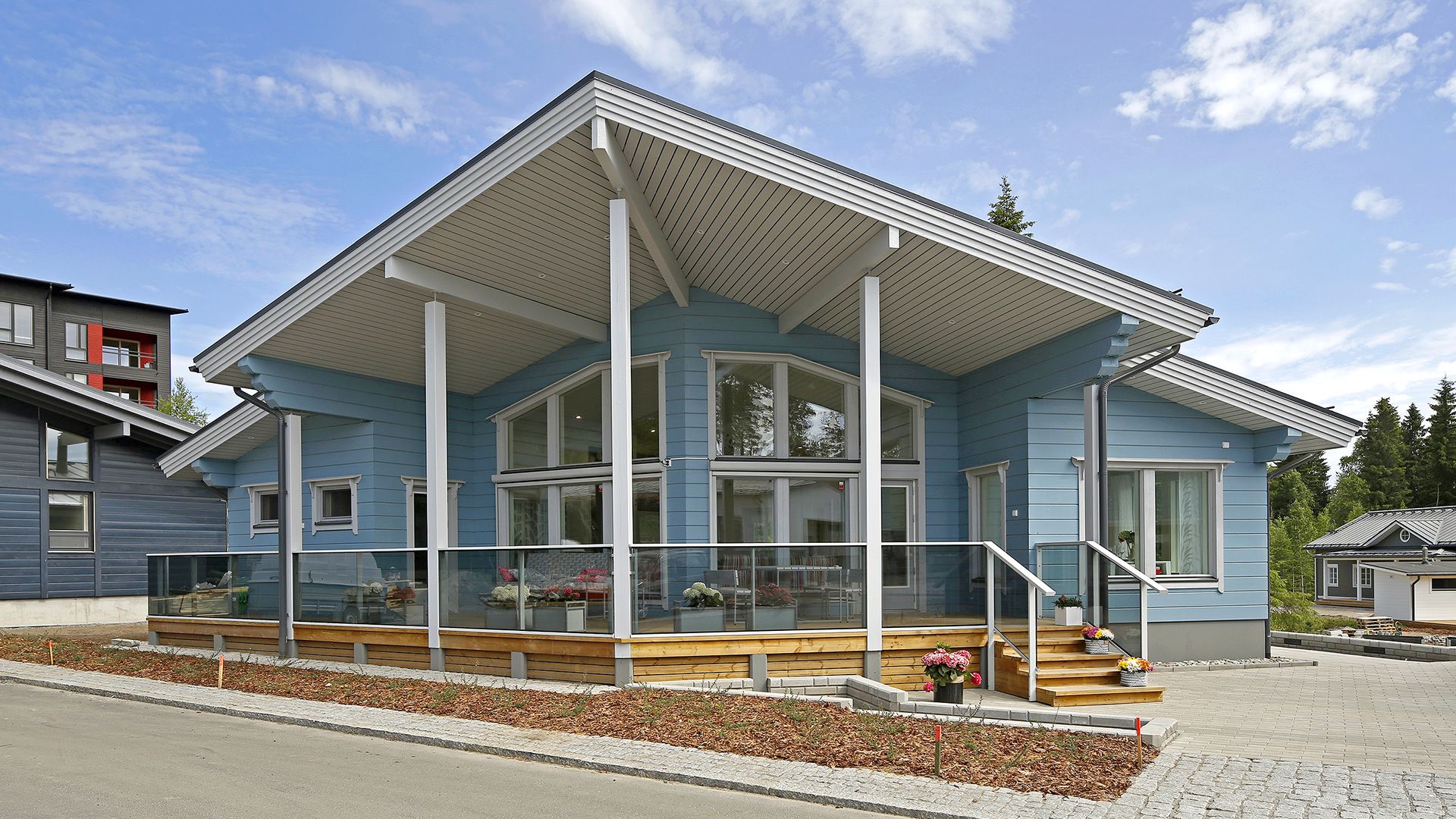 Площадь соответствуют стандартному проекту, но форма здания далека от оригинала. Открытая планировка гостиной Nuuna очаровали многих. Эта версия, оснащенная двумя спальнями, навесом для автомобиля и зимним садом на передней террасе, была признана победителем ярмарки домов отдыха в Калайоки в 2014 году.