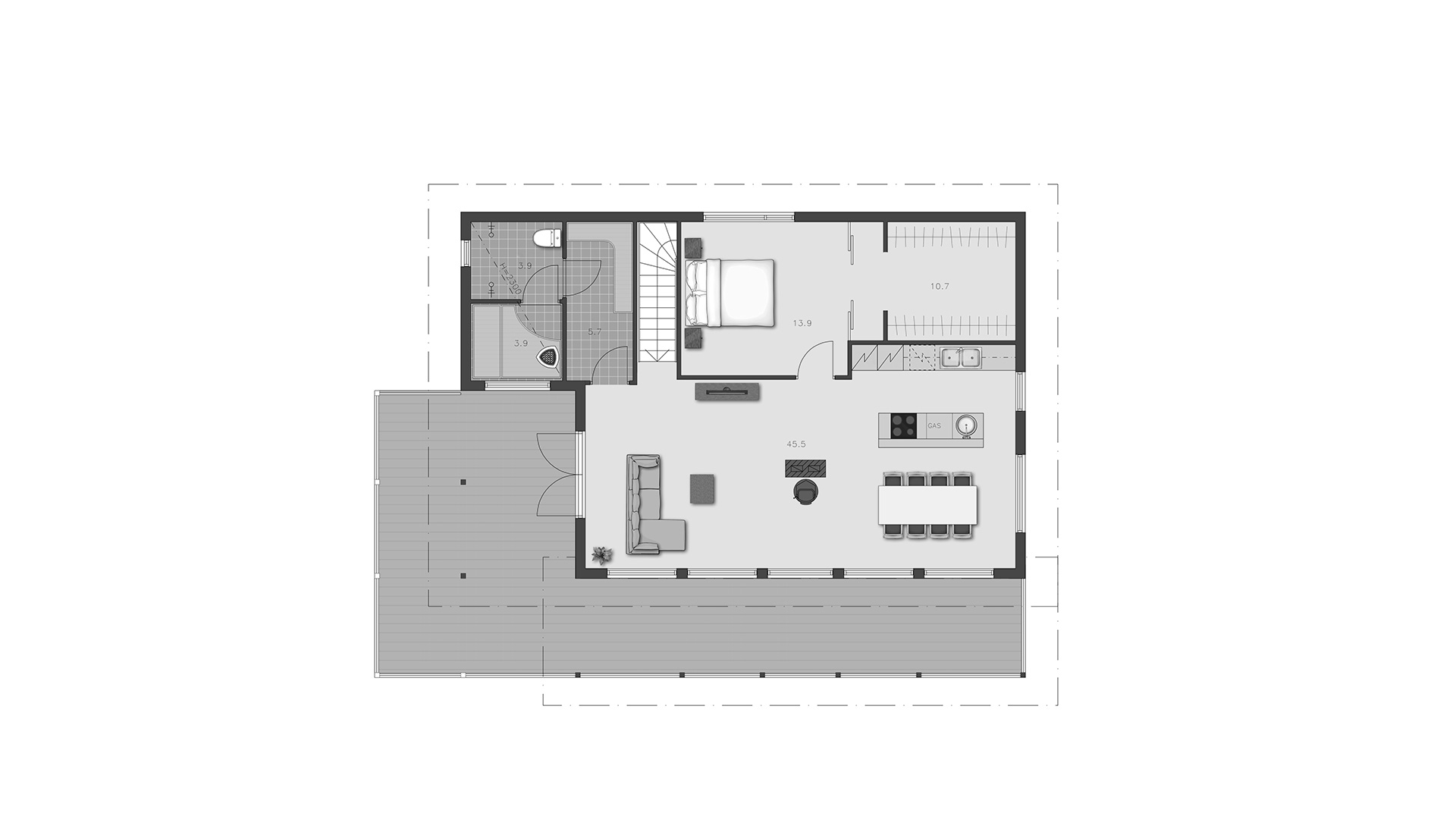 Вход в дом ведет вас в просторный вестибюль, который также предлагает выход на большую террасу. Светлая гостиная с кухней и сауной находятся на втором этаже, который кажется больше из-за балкона.
