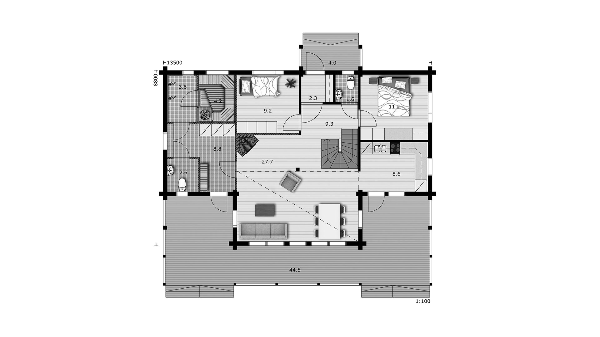 Первоначально был спроектирован как дача для большой семьи. Но превосходно подходит в качестве отдельного дома для круглогодичного проживания.