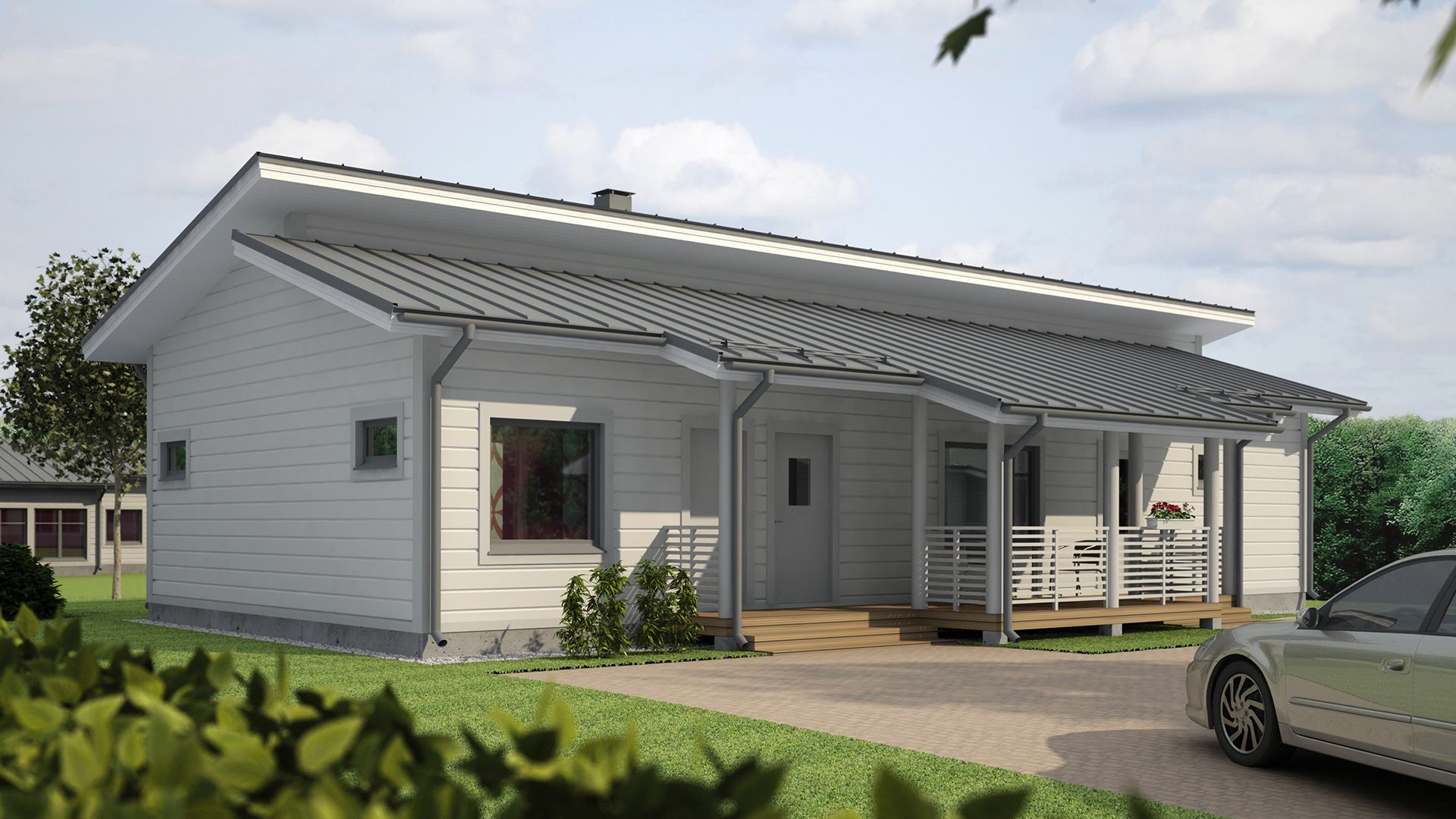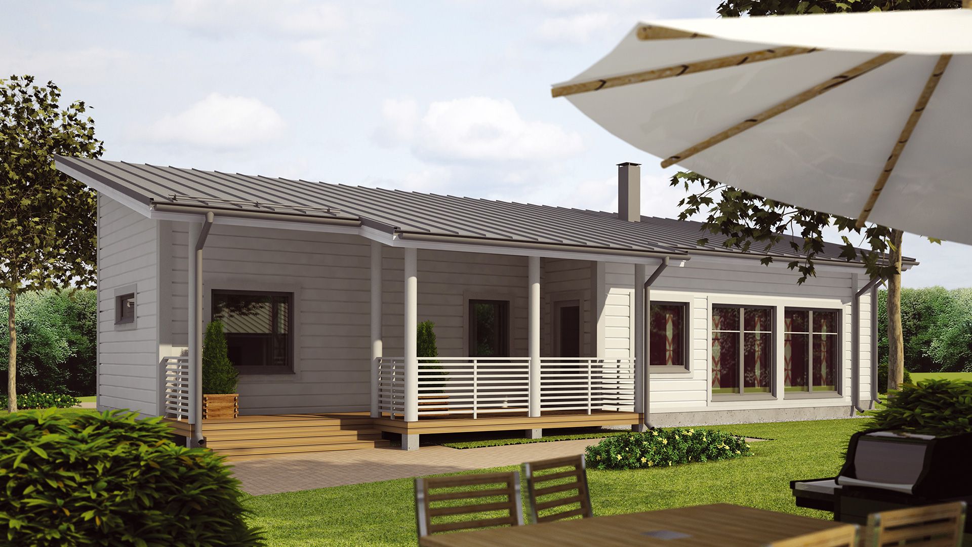 Ступенчатая двускатная крыша придает длинному дому современный вид. На крытой террасе достаточно места для обеденного стола, где летом можно приятно провести время.