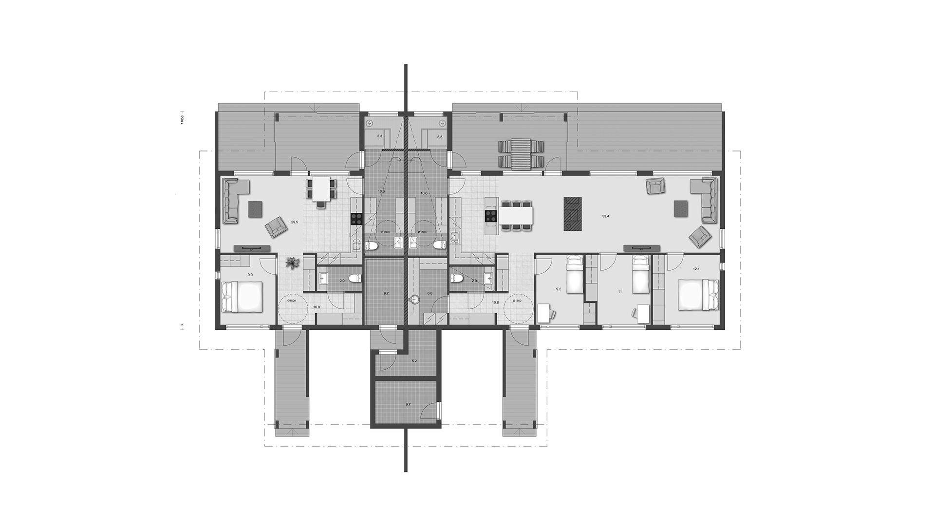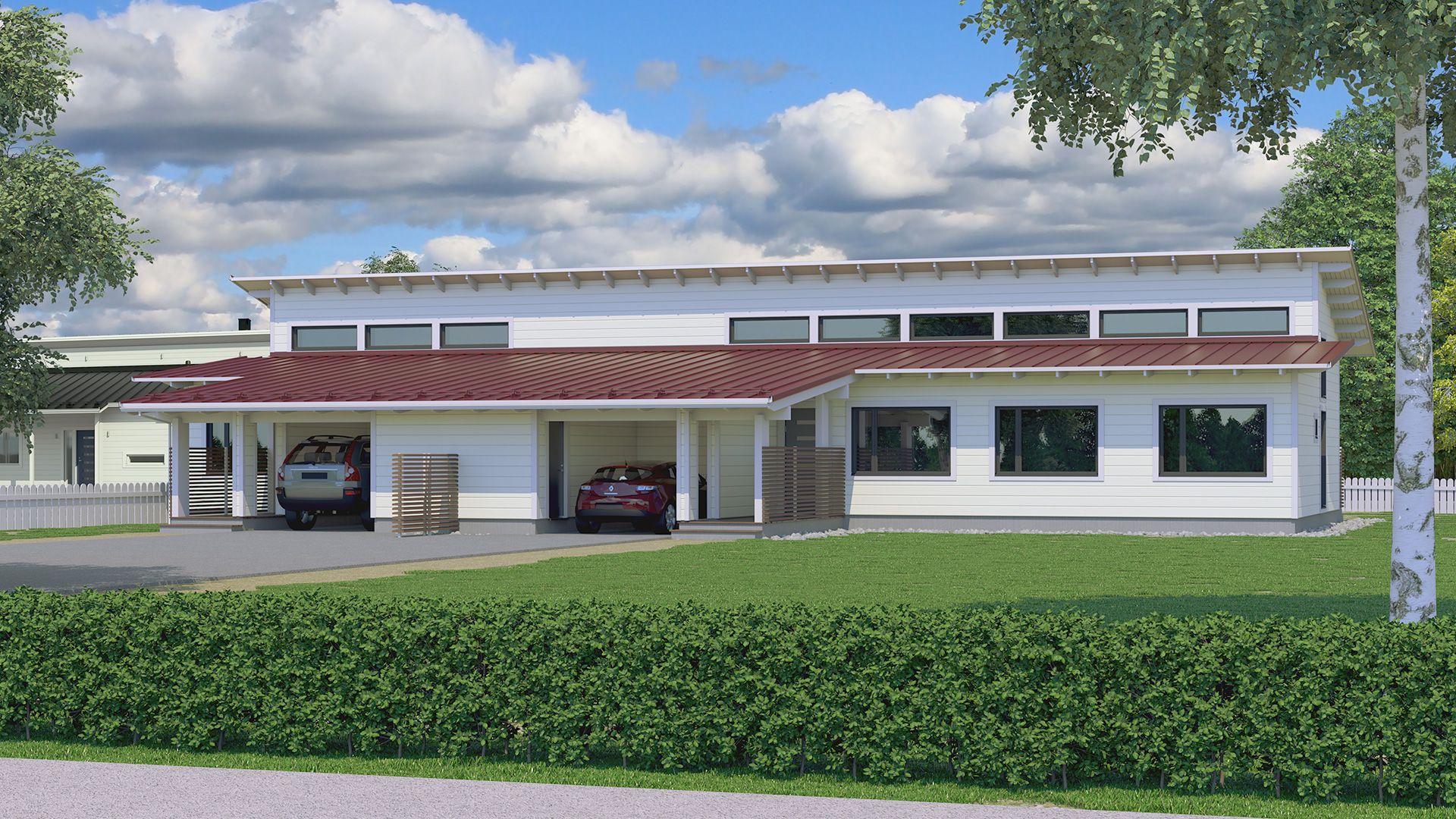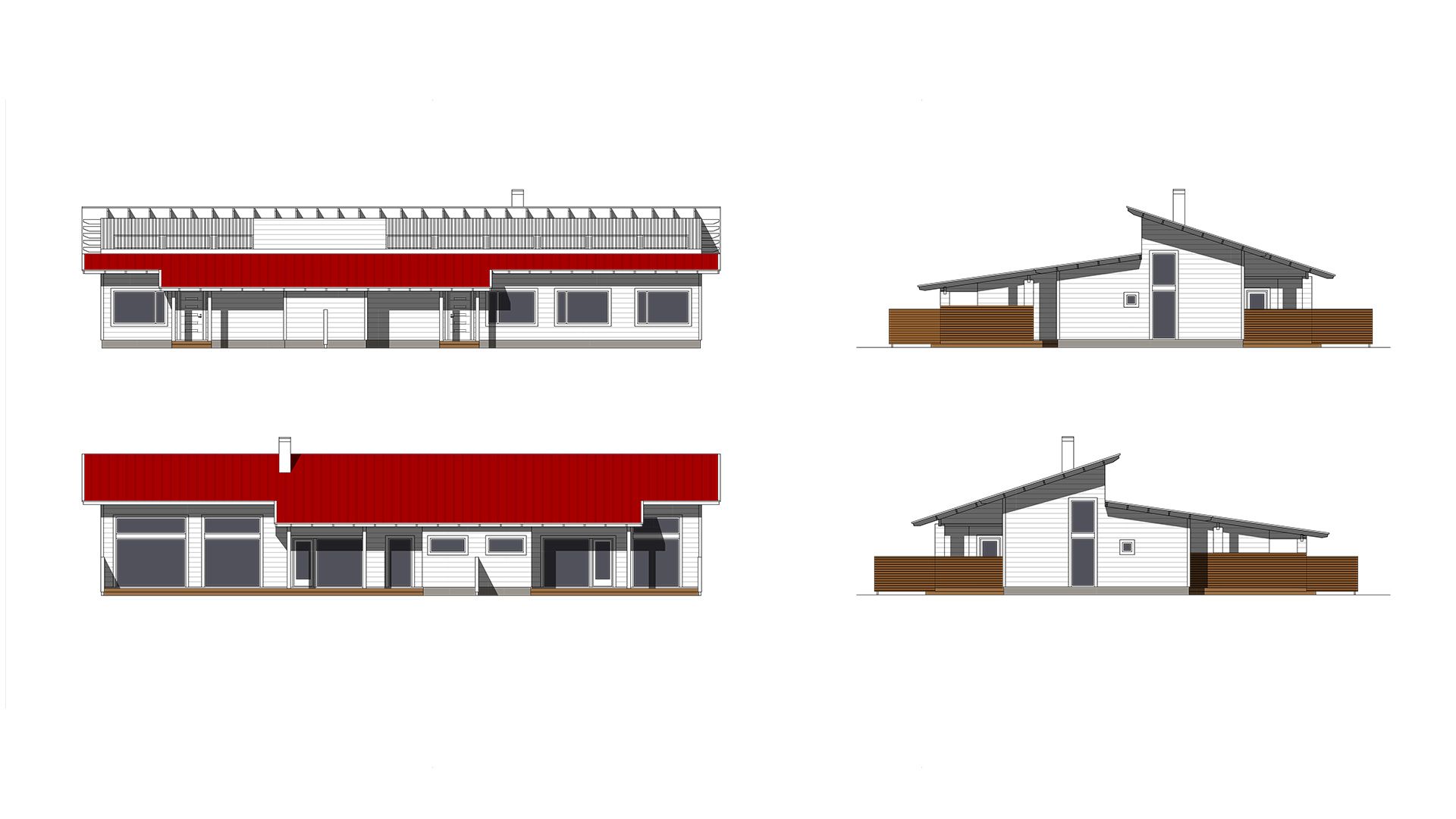 Дом для двух семей сочетает в себе просторную семейную основной дом и небольшой дом, который подходит, например, в качестве пристройки для родных старшего поколения. Меньшая часть дома имеет площадь 64 м2, а большая-174 м2. Большие окна от пола, а также ряд окон на коньке крыши, обеспечивают наличие света почти весь день.